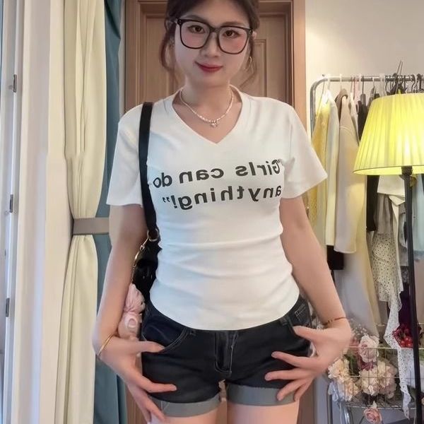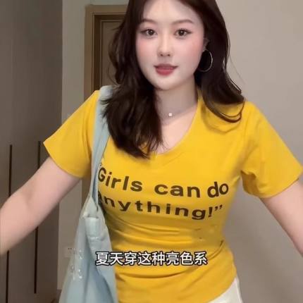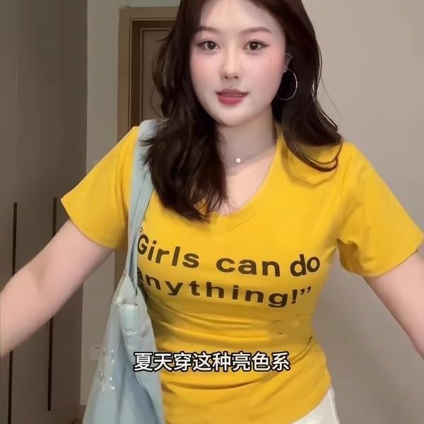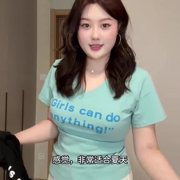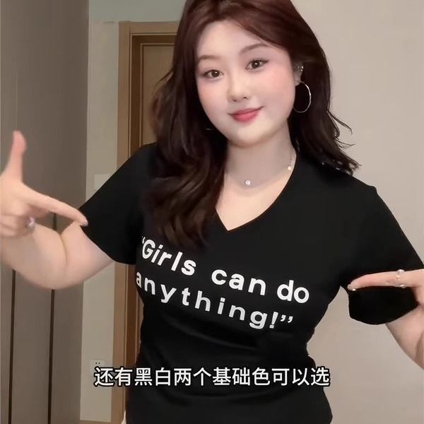 大码胖MM高级时尚显瘦甜美女装夏季新款V领小众短袖女上衣240斤