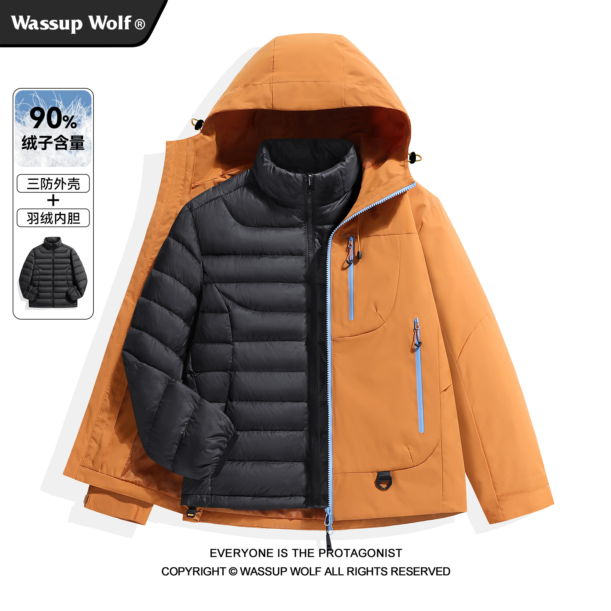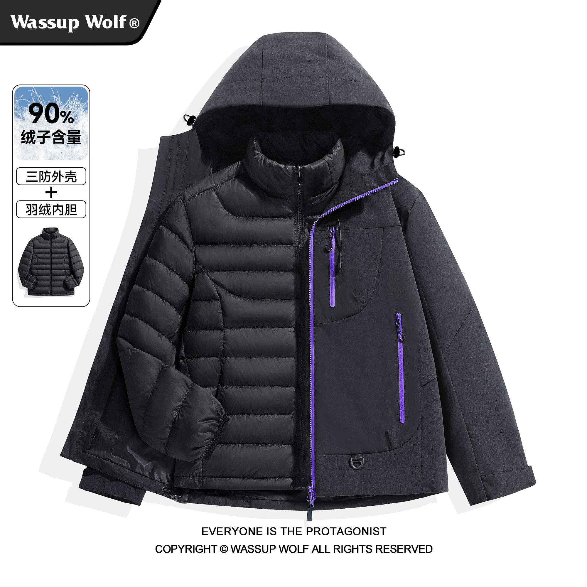 Wassup Wolf羽绒服男女秋冬季户外加厚防寒三合一冲锋衣滑雪外套