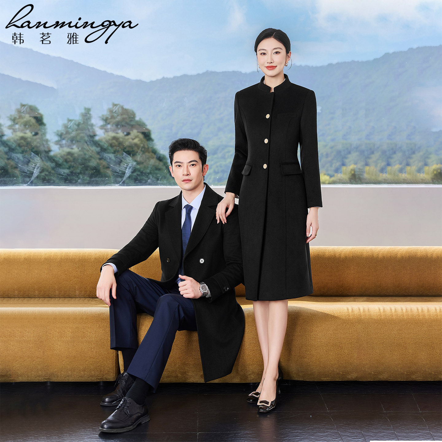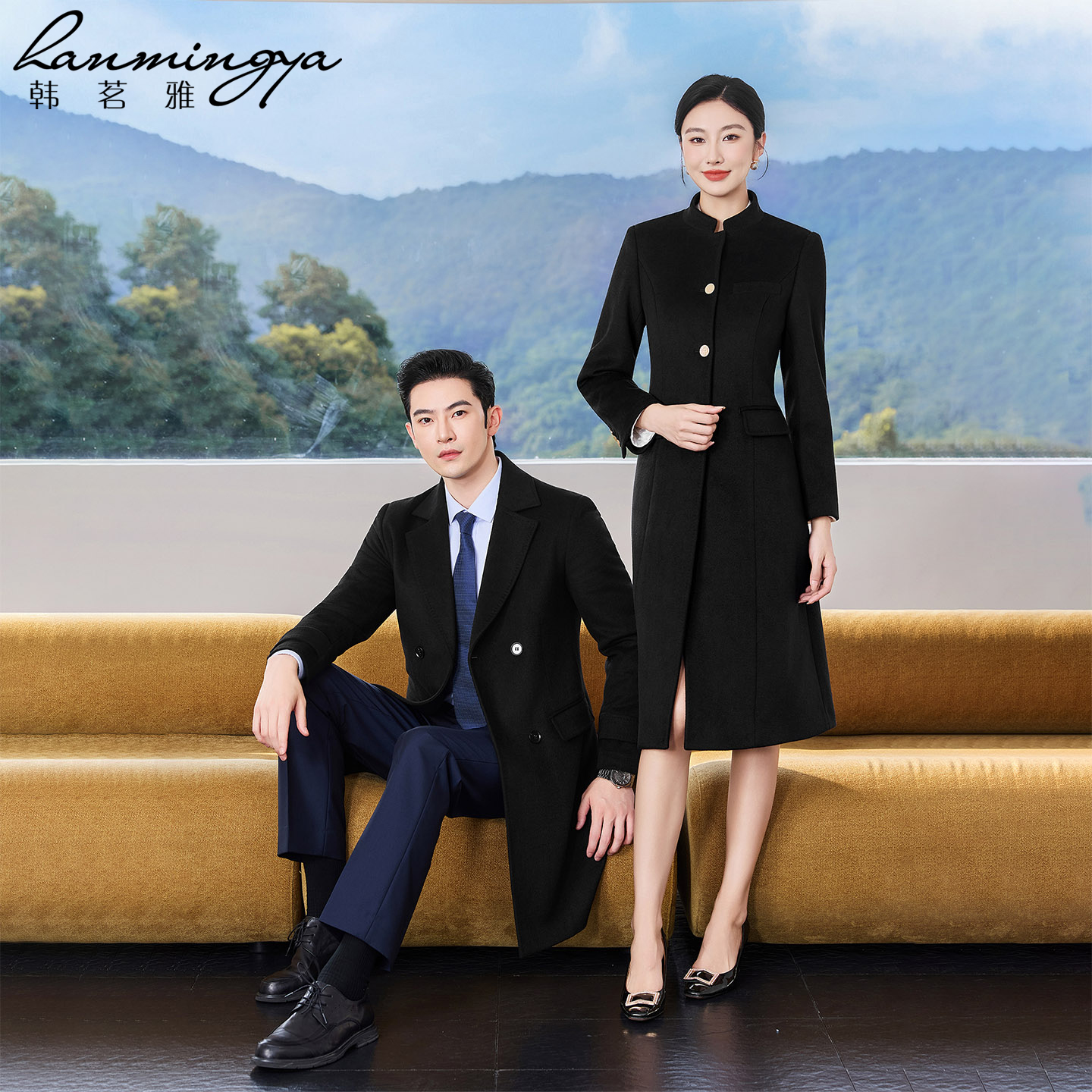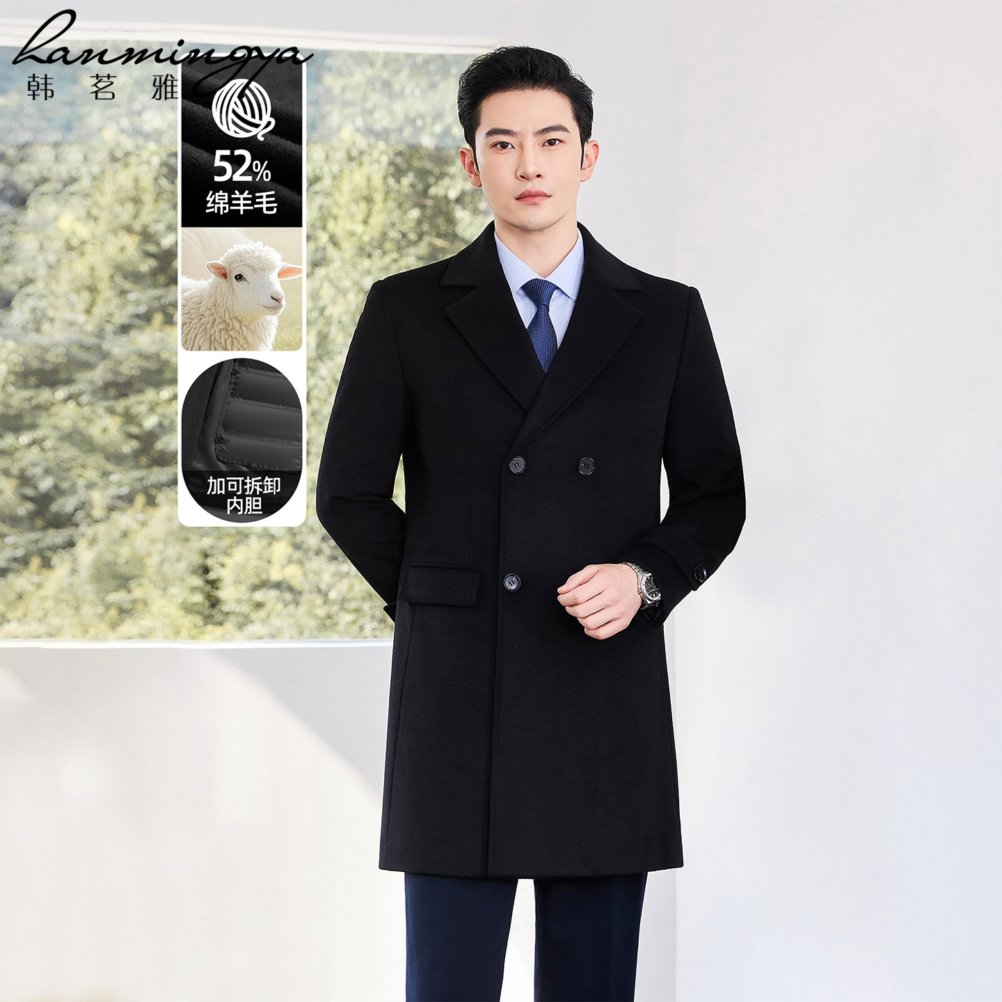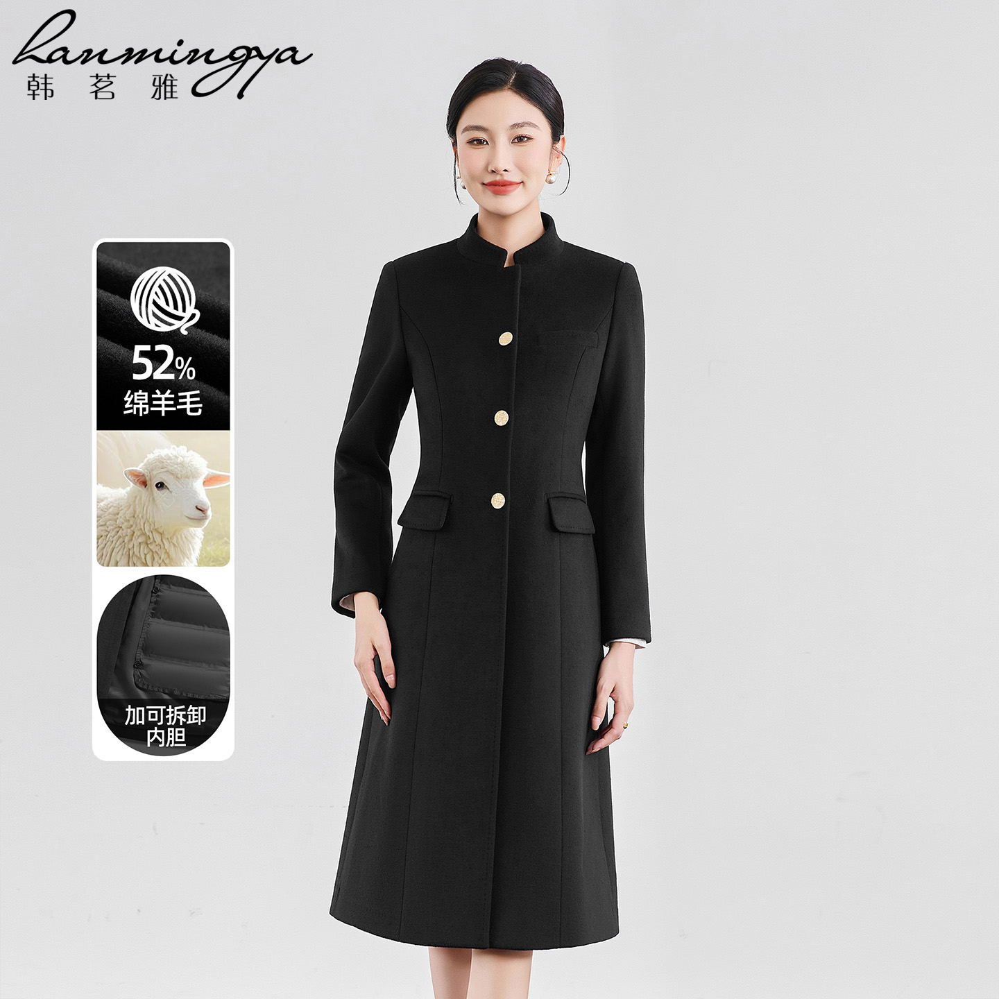 韩茗雅高端羊毛呢大衣女羽绒内胆黑色毛呢外套中长款售楼部工装男