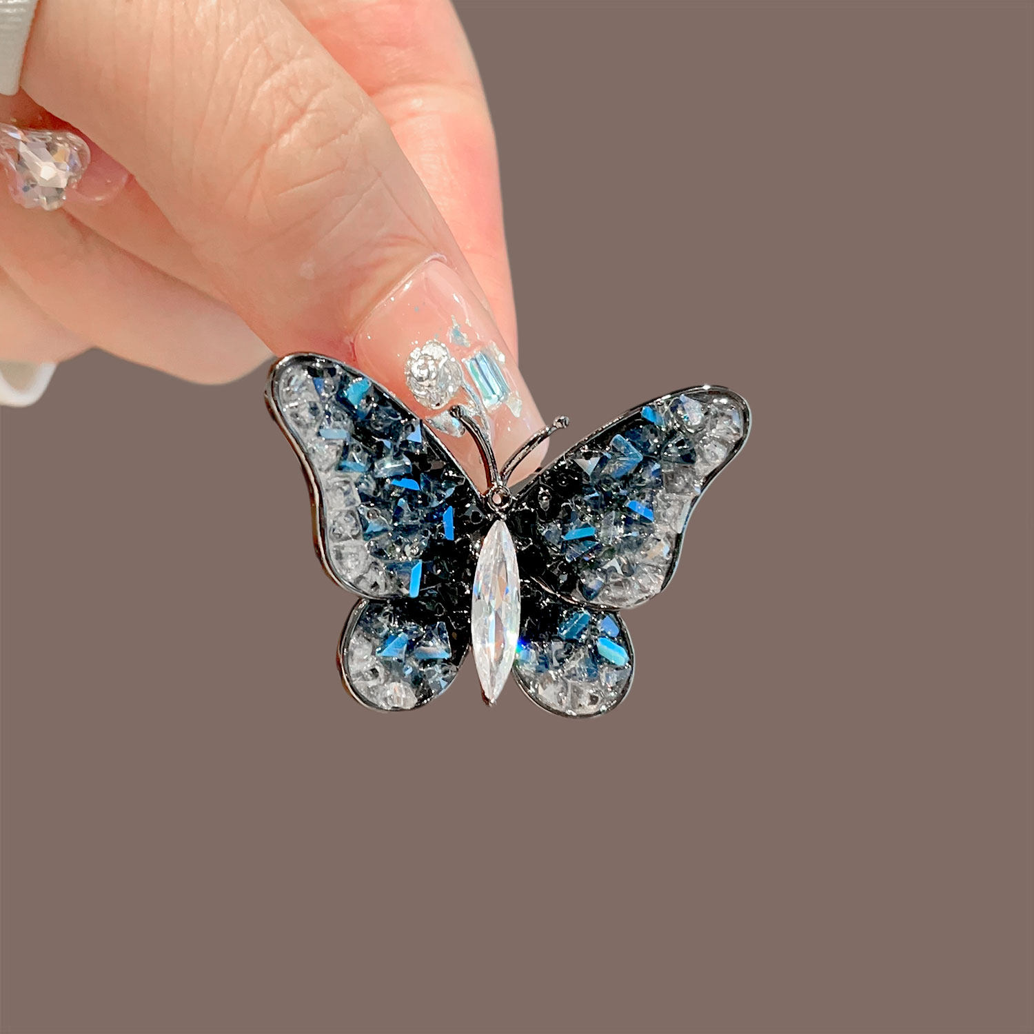 高档复古蓝水晶蝴蝶胸针男女精致小众别针气质西装胸花高级感配饰