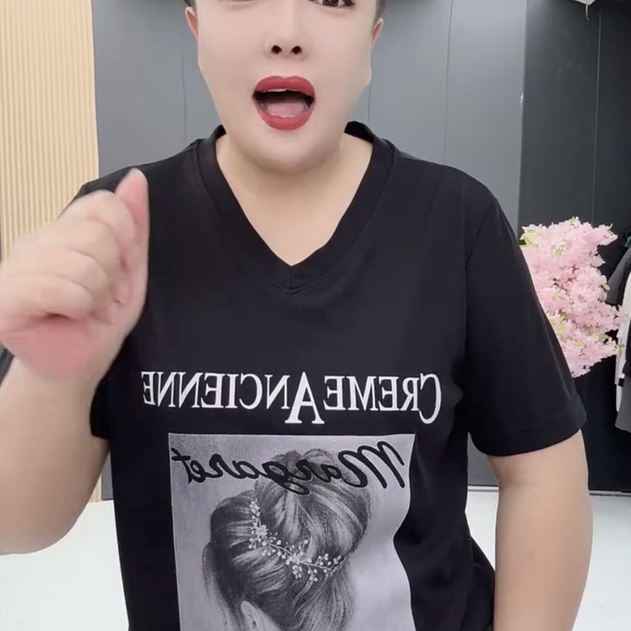 宽松大码V领短袖上衣夏季新款百搭减龄休闲舒适中年妈妈打底衫女