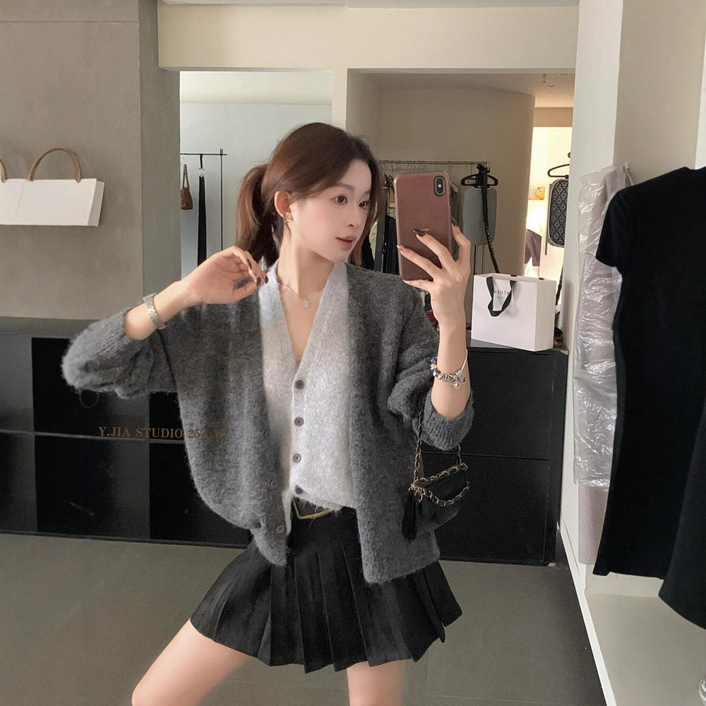 美拉德咖色撞色假两件V领针织开衫女秋季高级感慵懒毛衣外套上衣