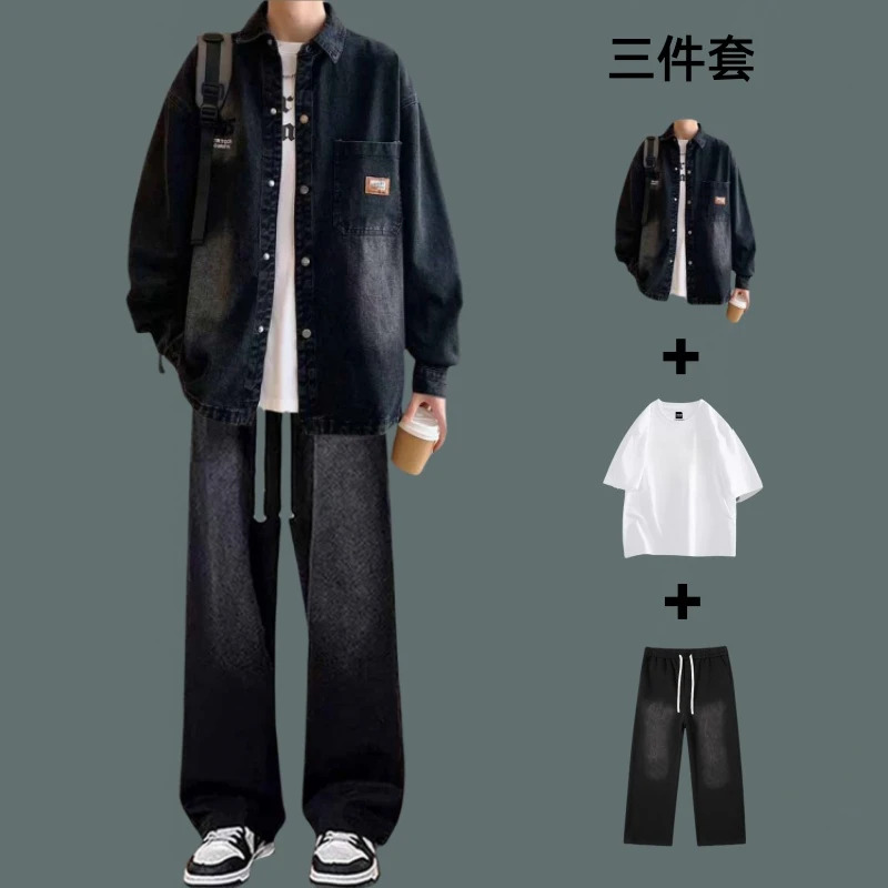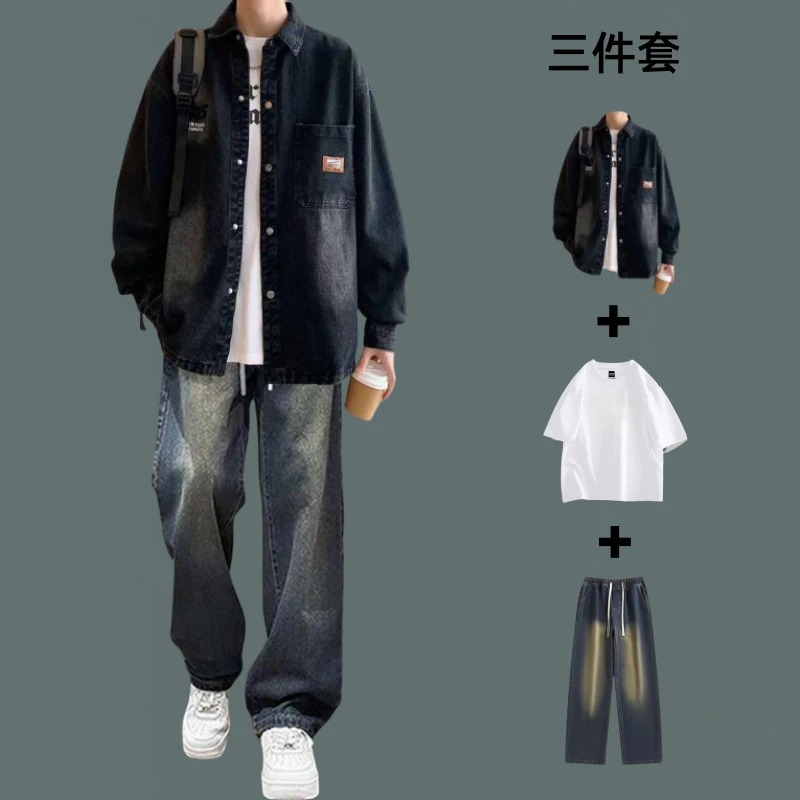 春秋薄款日系工装风外套男士套装潮牌痞帅休闲牛仔衬衫搭配牛仔裤