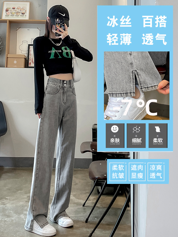 烟灰色牛仔裤女松紧腰阔腿直筒裤