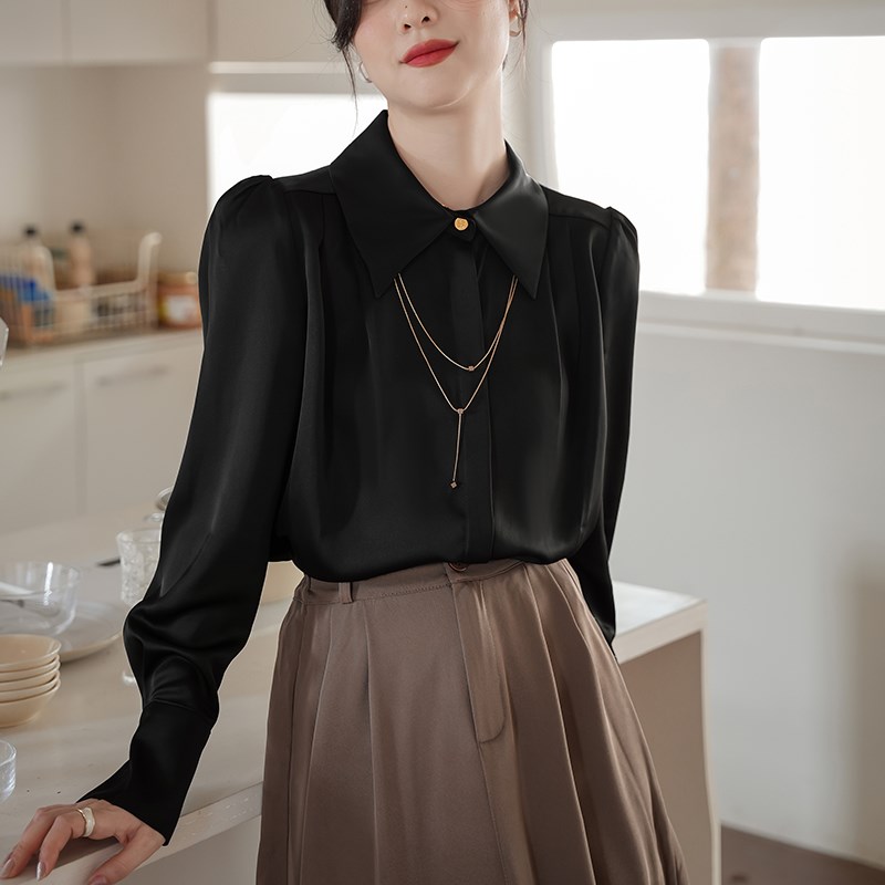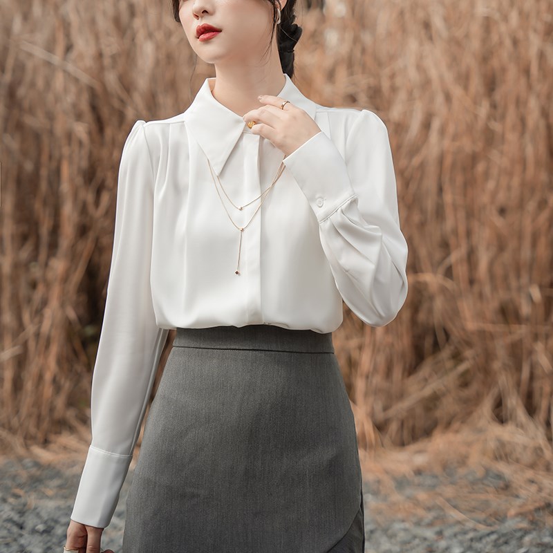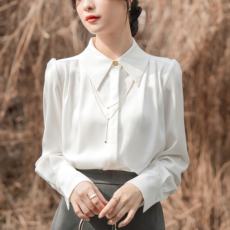 白色衬衫女2025春装新款法式气质翻领链条职业上衣高级感缎面衬衣