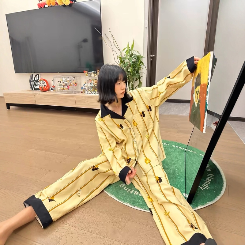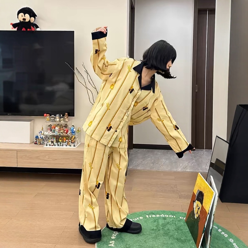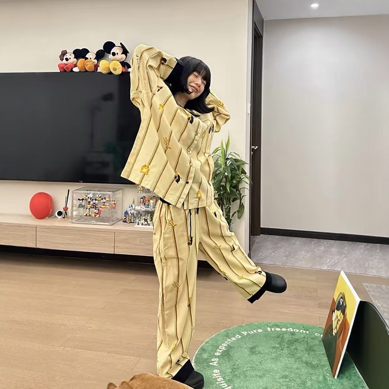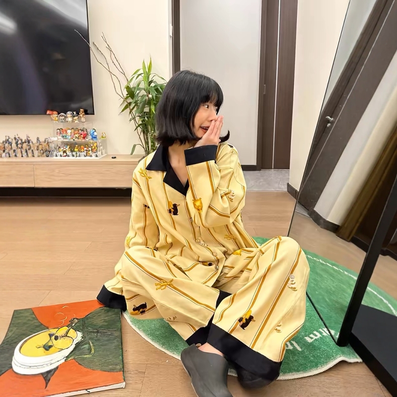 ins高级条纹长袖睡衣秋季女款2024新款衬衫长裤家居服休闲套装秋