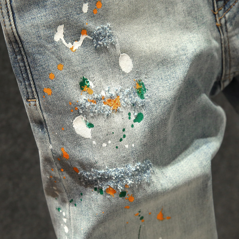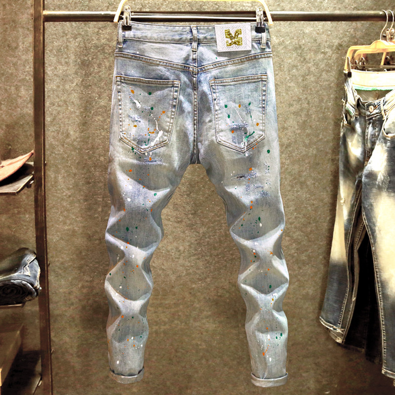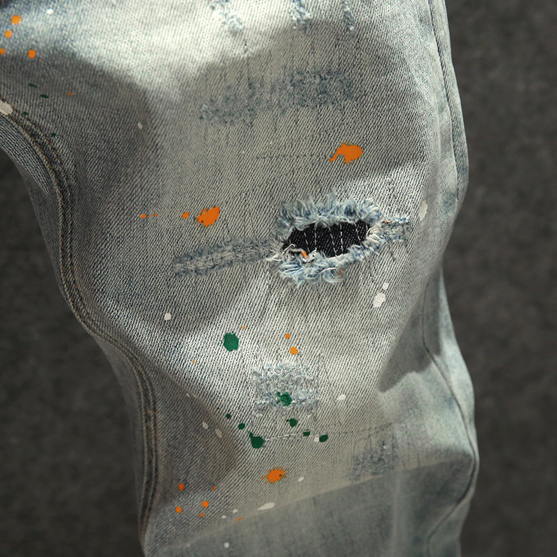 春秋季时尚潮牌牛仔裤男韩版修身小脚裤潮流破洞补丁泼墨长裤厚款