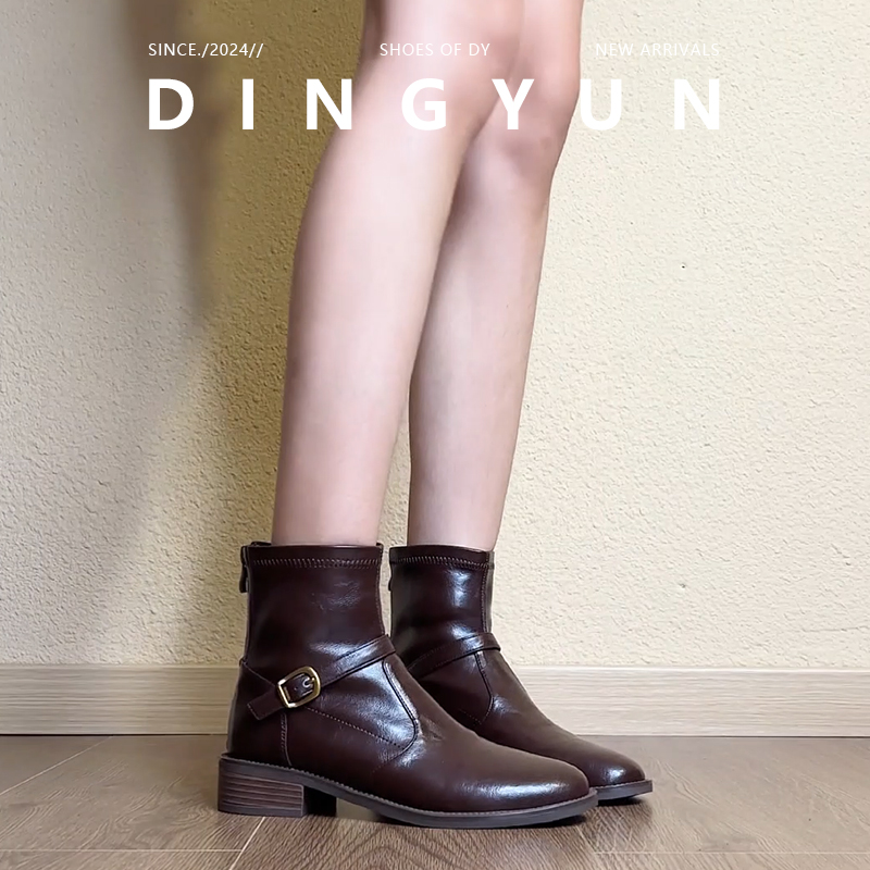 【丁允】复古棕色皮带扣平底中筒靴女英伦西部骑士靴圆头短靴粗跟