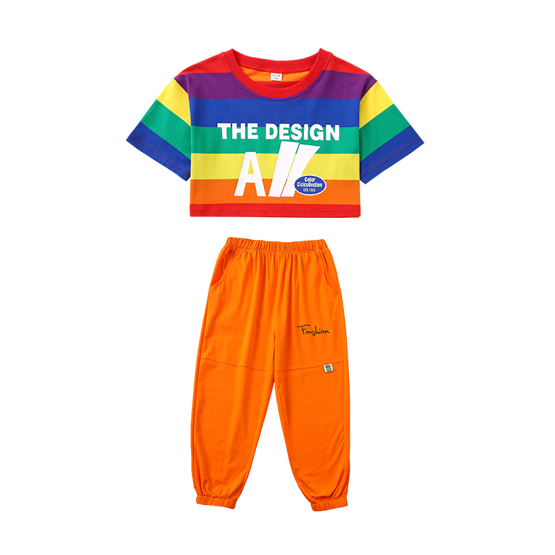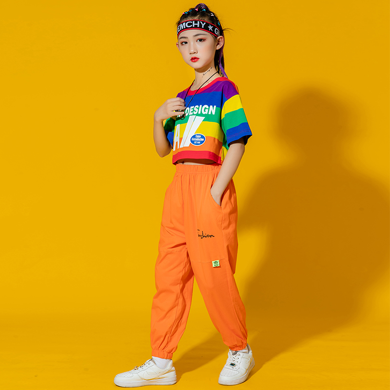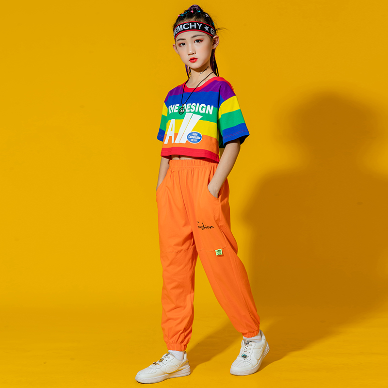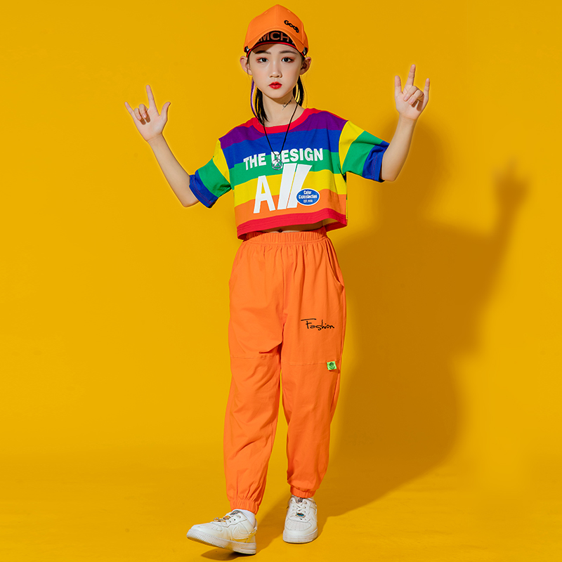 速发童露脐街舞服儿童彩虹模特走秀服少儿hiphop套装爵士舞表演服