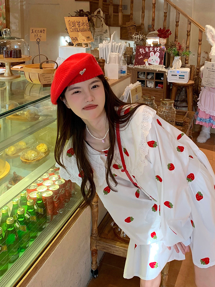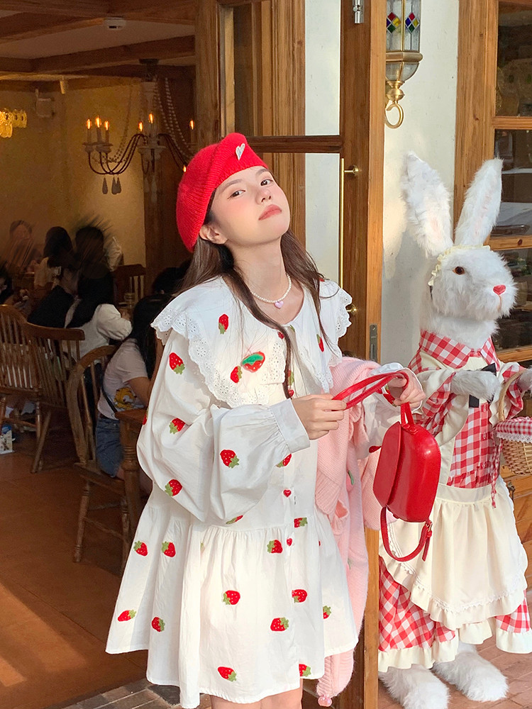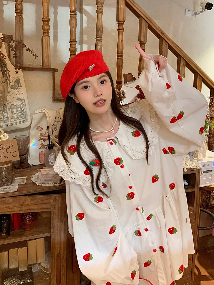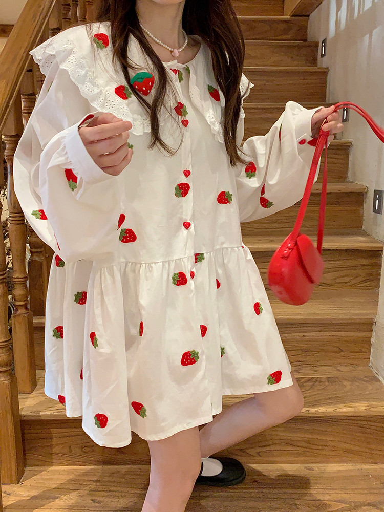 甜美减龄长袖衬衫裙子女春秋新款重工印花草莓娃娃领宽松慵懒裙子