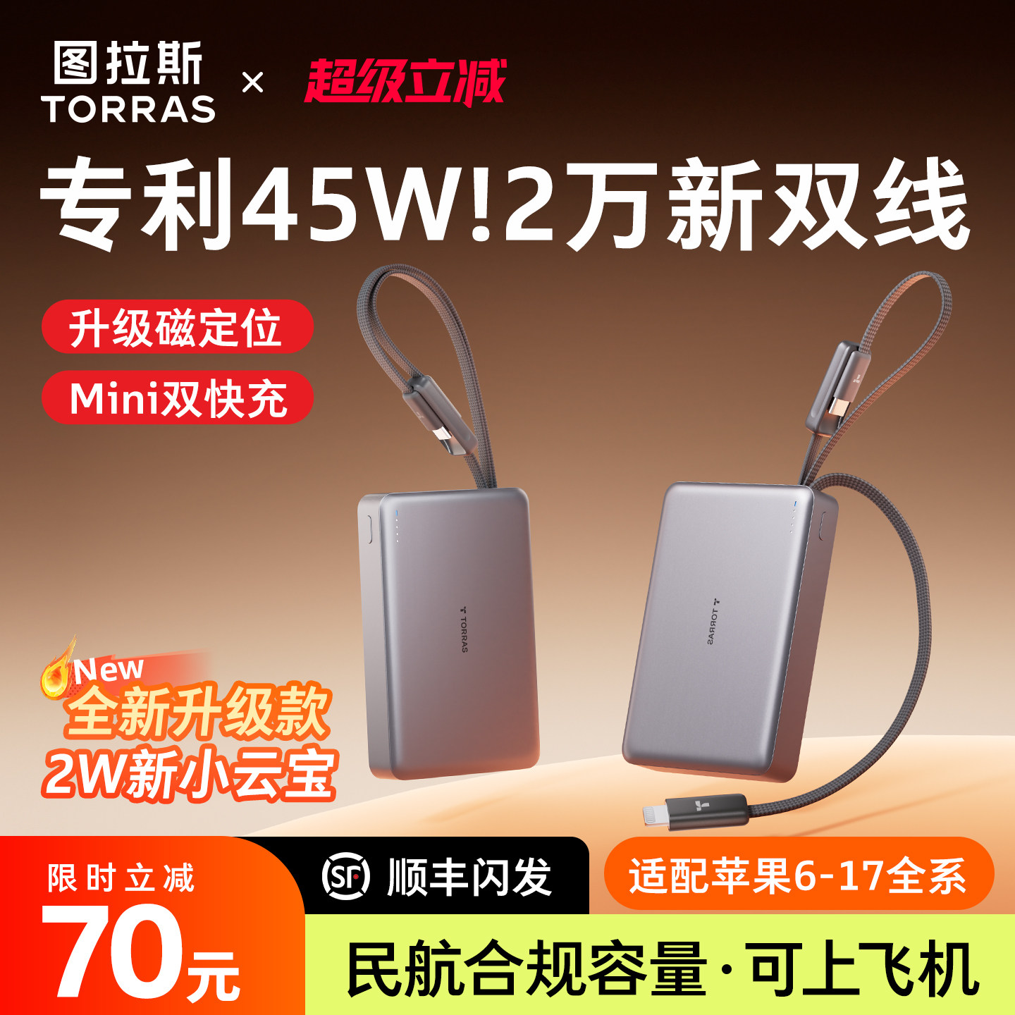 图拉斯20000毫安自带双线小云宝2026新款45W充电宝3C认证可上飞机大容量快充便携移动电源适用苹果华为小米2w