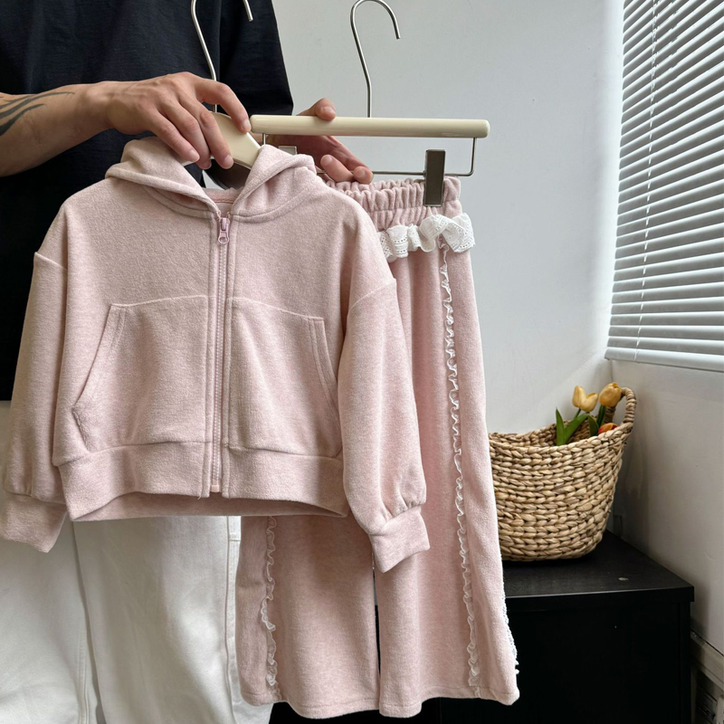 女童运动套装2025秋季新款儿童休闲蕾丝花边连帽卫衣阔腿裤两件套