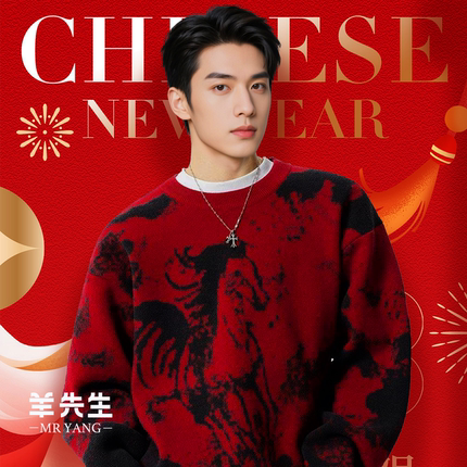 马年新春跨年战袍红色羊绒衫男圆领2026新款本命年宽松慵懒毛衣潮