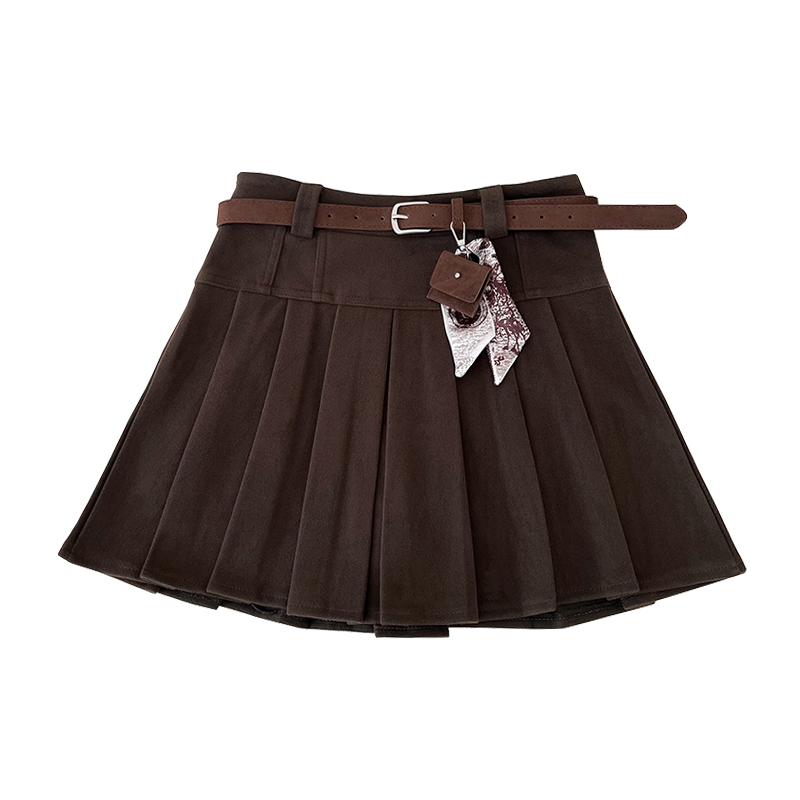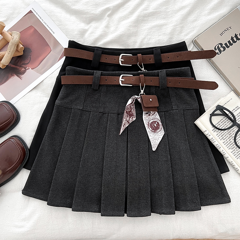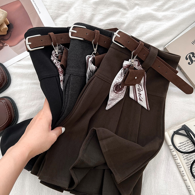 韩版设计感时尚毛呢高腰显瘦半身裙百褶裙防走光短裙a字裙配皮带