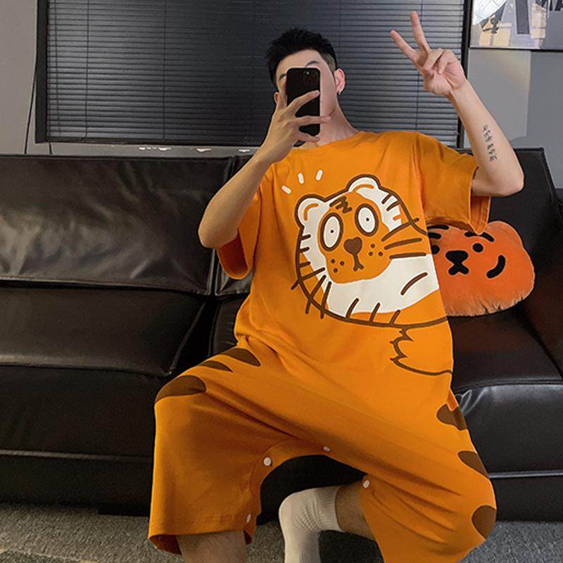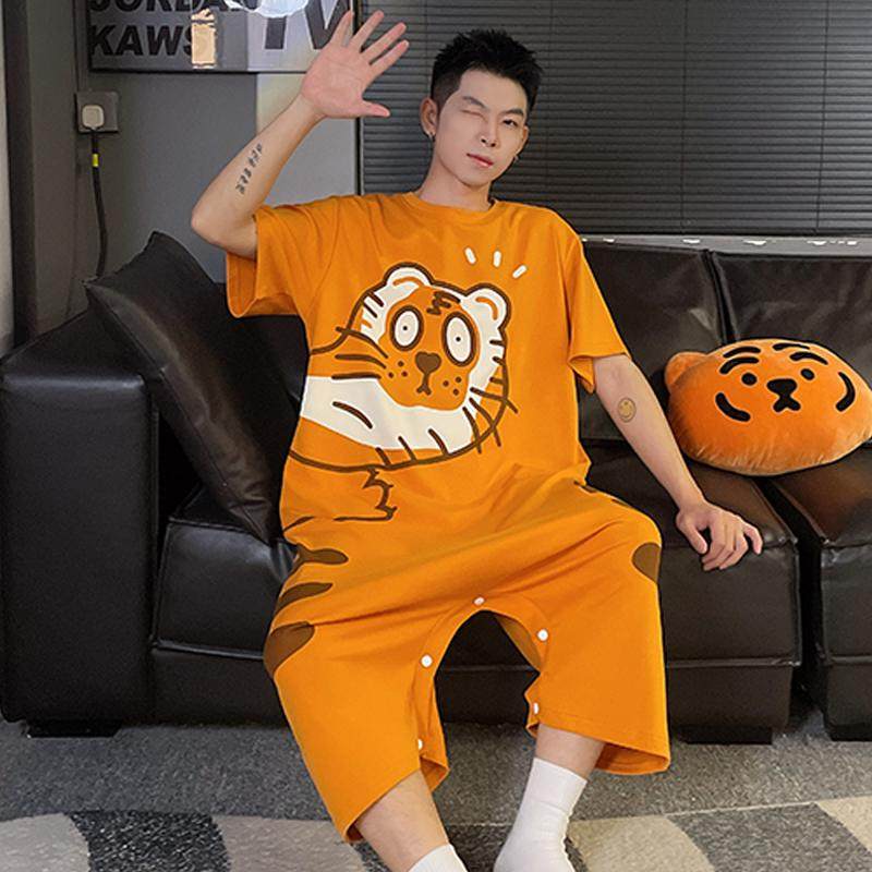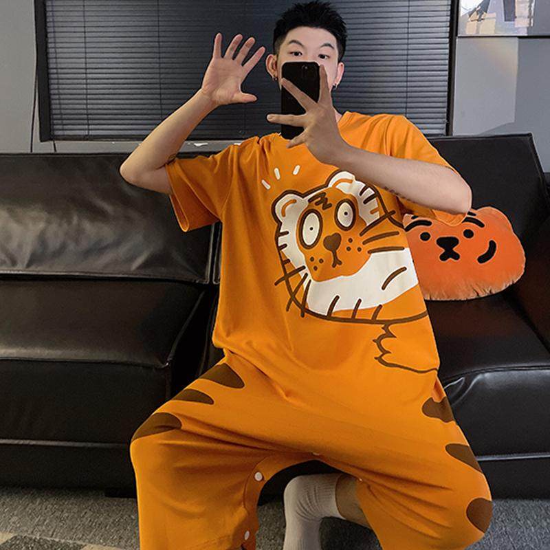 连体睡衣男夏季情侣薄款短袖纯棉家居服套装卡通学生青少年大码