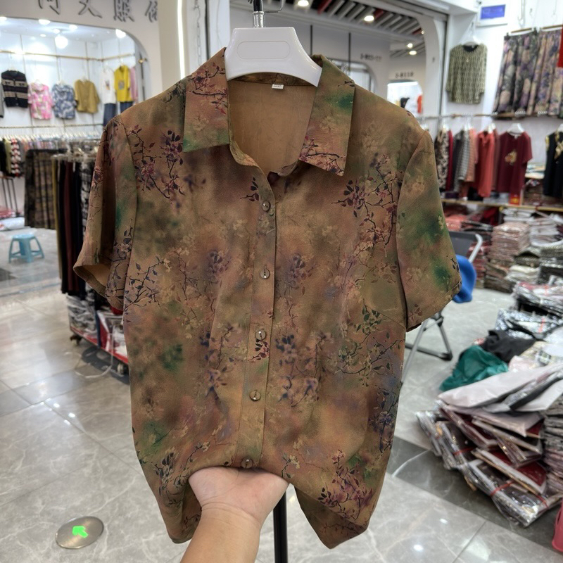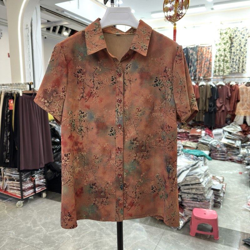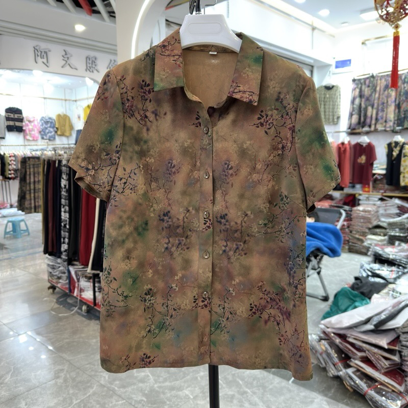 妈妈装仿真丝翻领印花短袖衬衫夏新款洋气减龄中老年上衣婆婆装