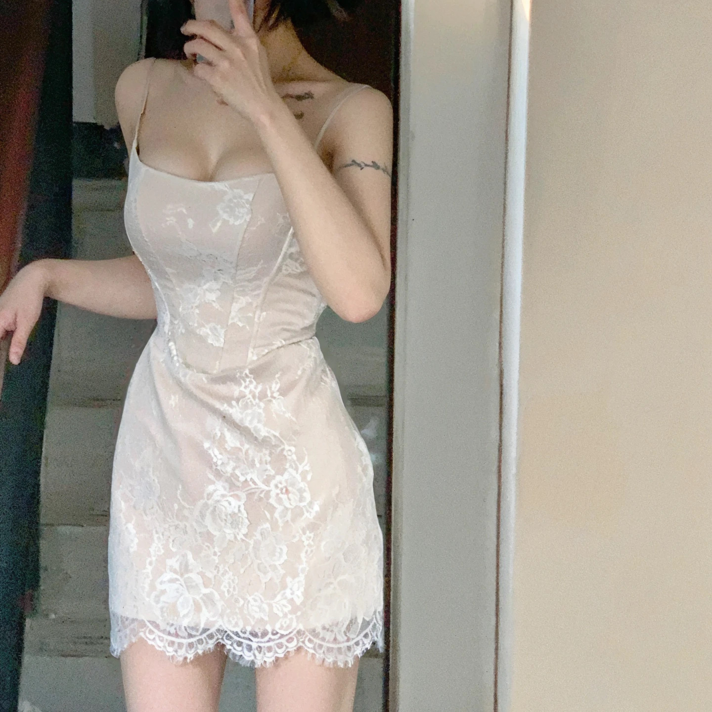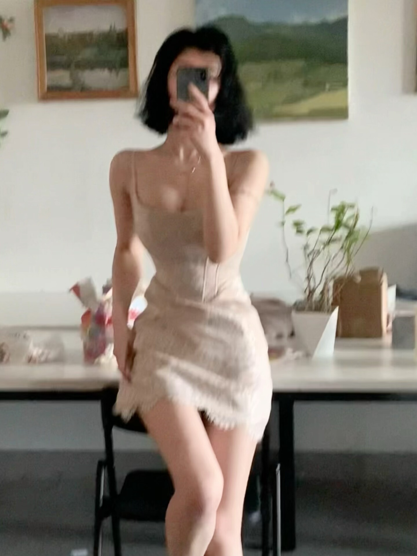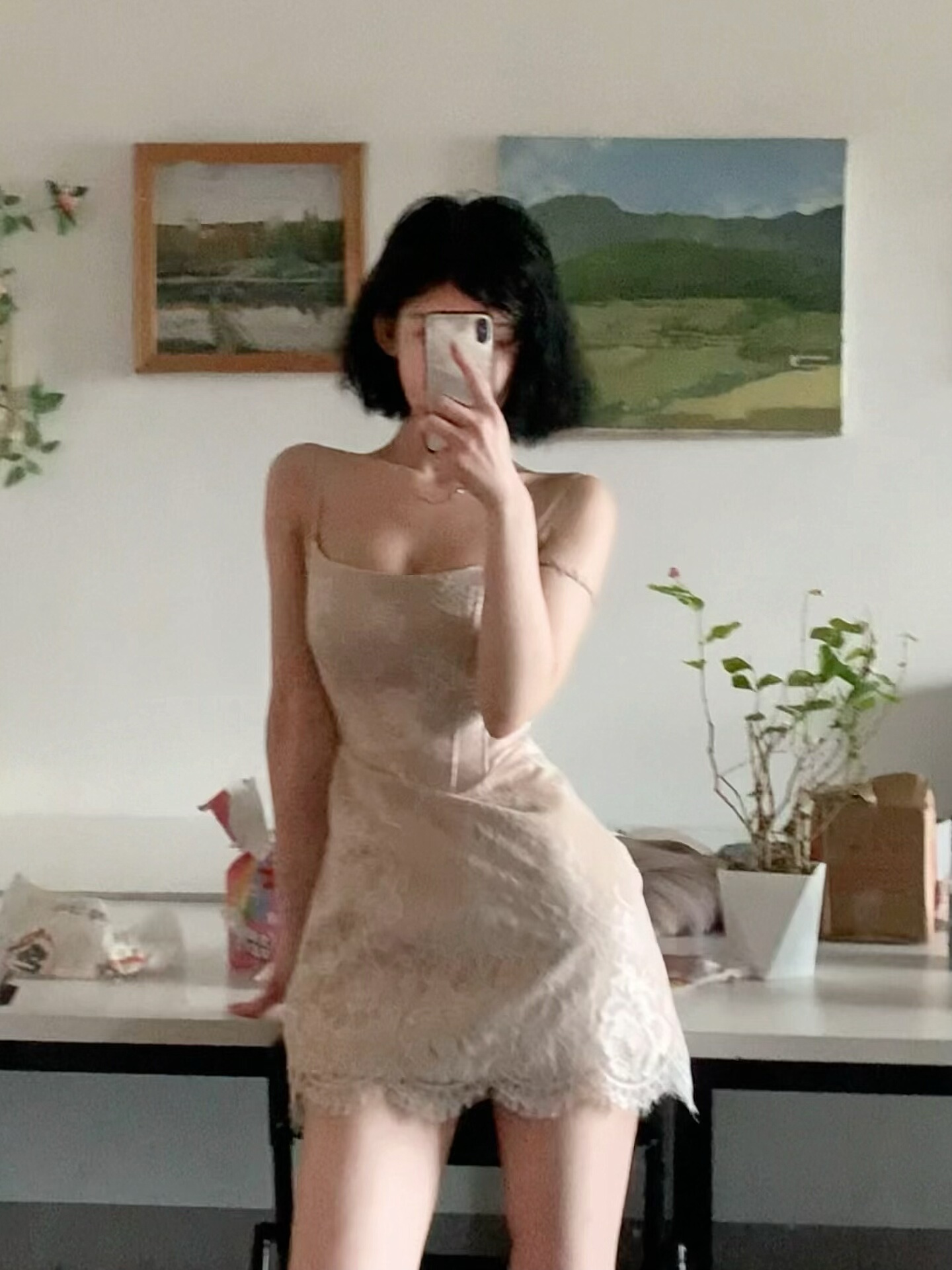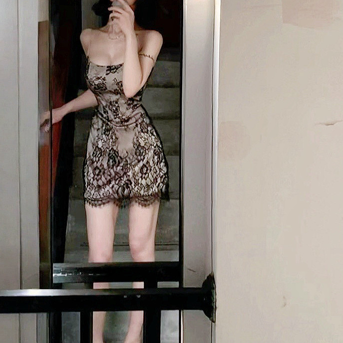 小糊兔的复古纯欲风性感辣妹黑色睫毛蕾丝女吊带背心无袖短裙包臀