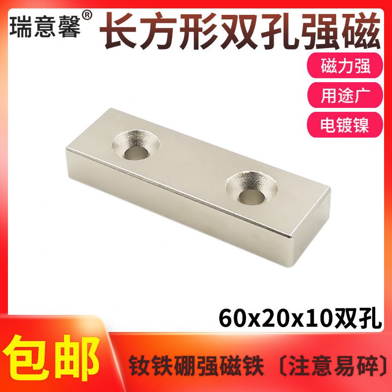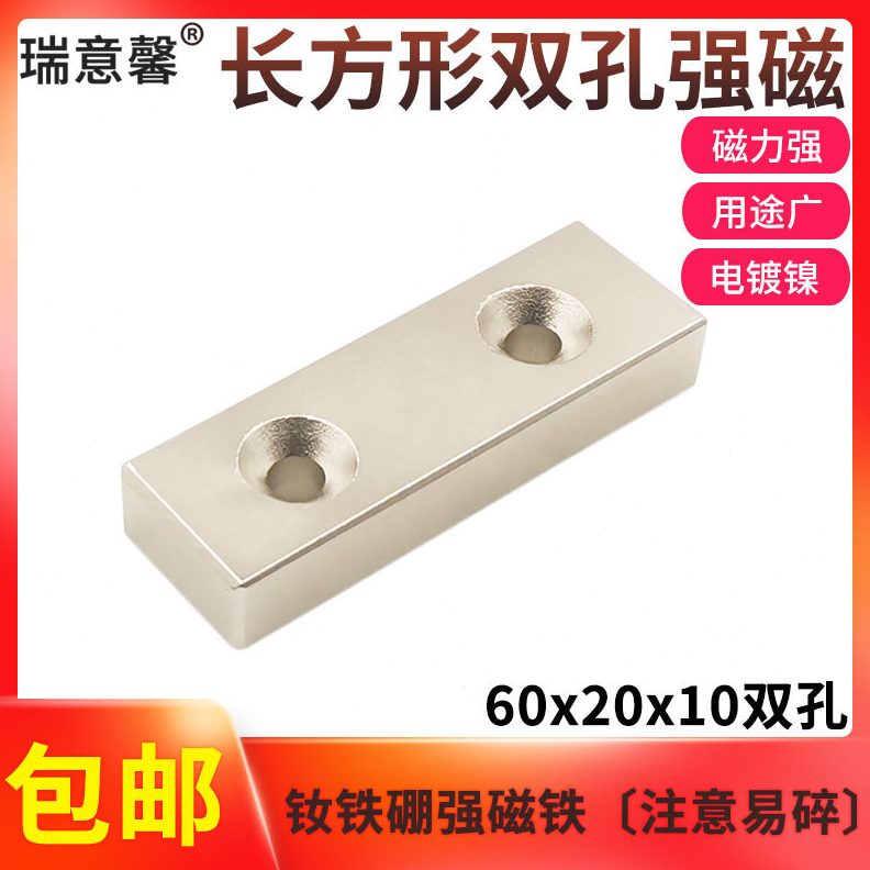 吸铁石强磁铁20x1强力磁铁mm双孔60钕高长方形0稀强土x硼度磁铁永