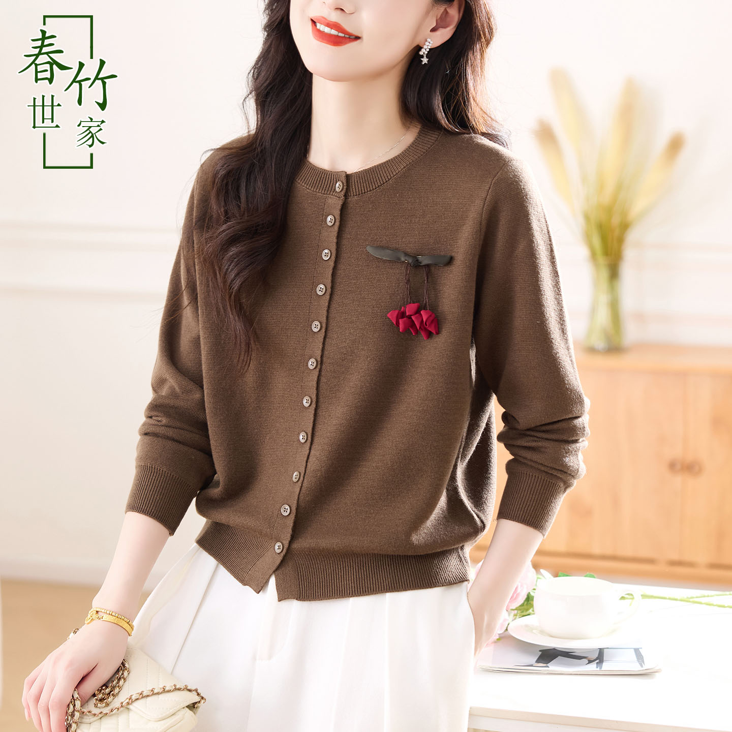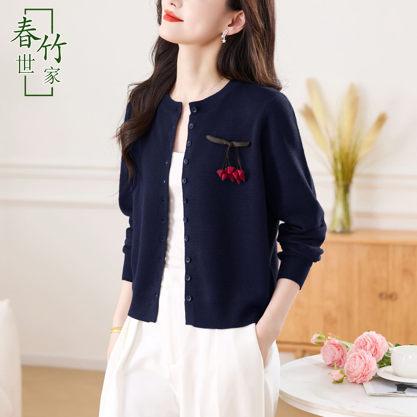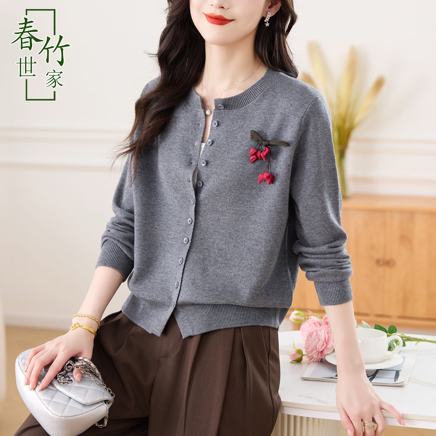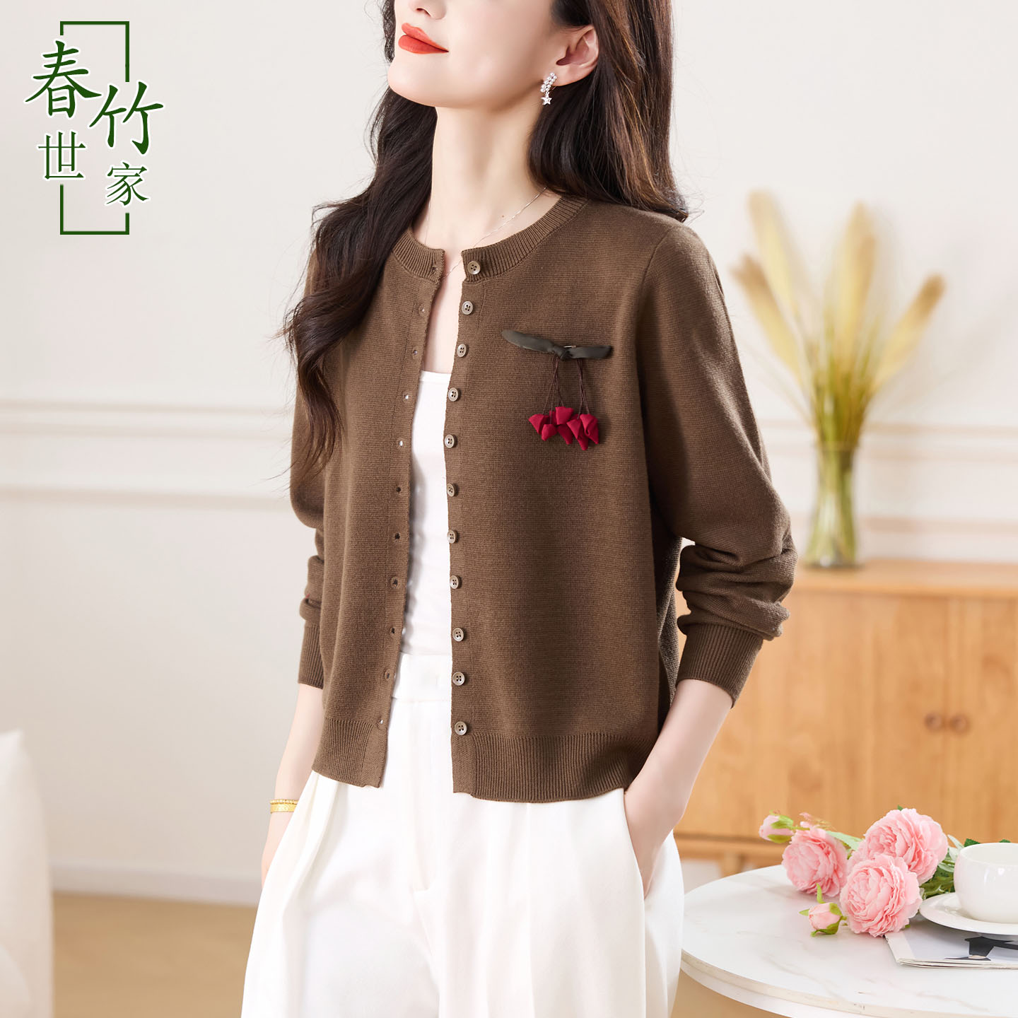 春竹短款秋季爆款长袖开衫小花胸针圆领单排扣针织衫女装毛衣外套