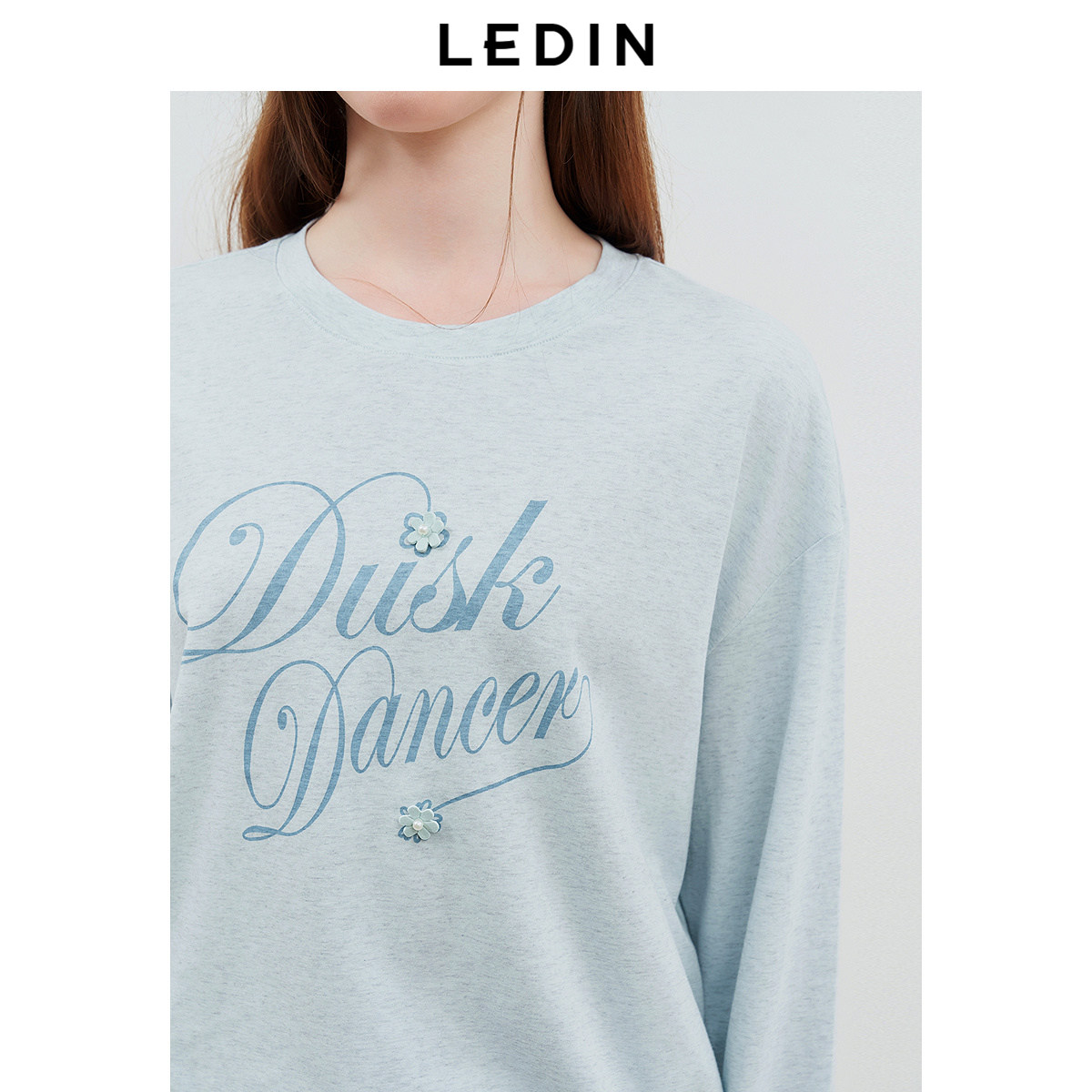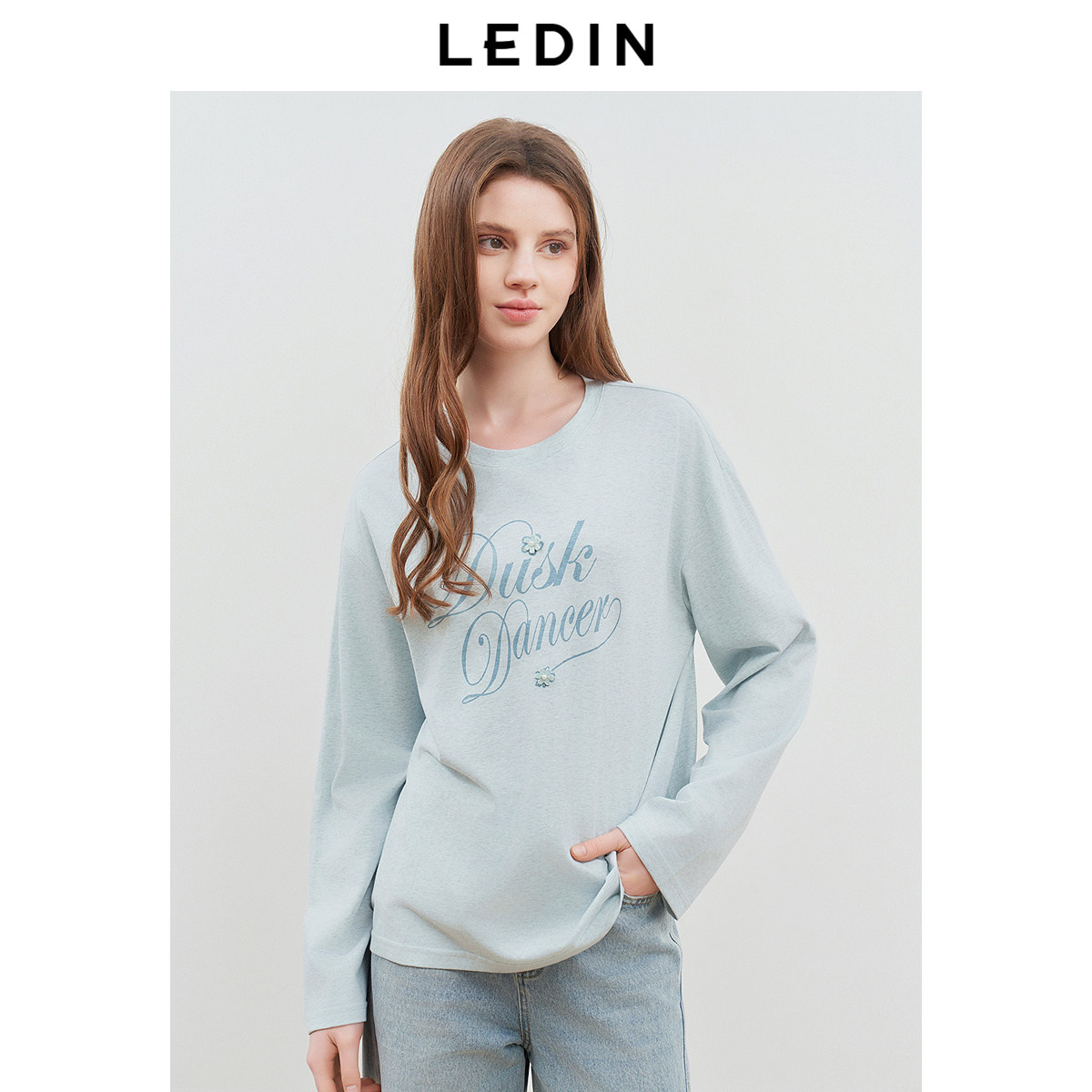 乐町2025春季新款韩系清甜花体字母印花简约圆领宽松落肩长袖T恤