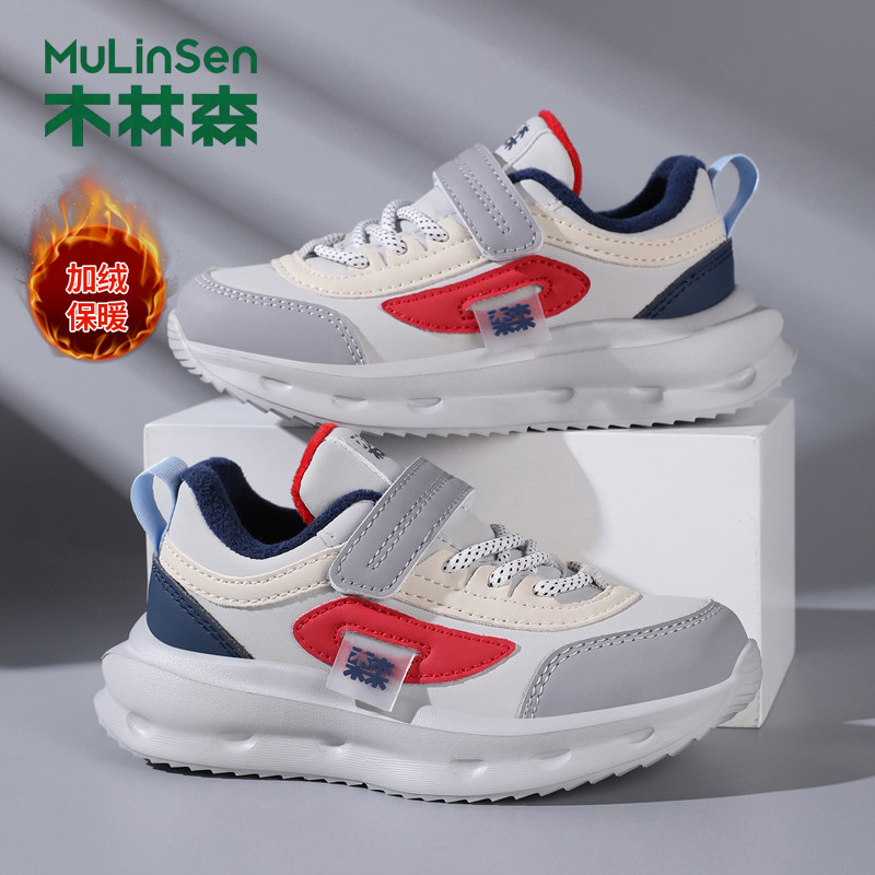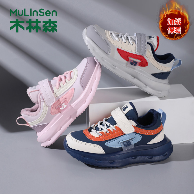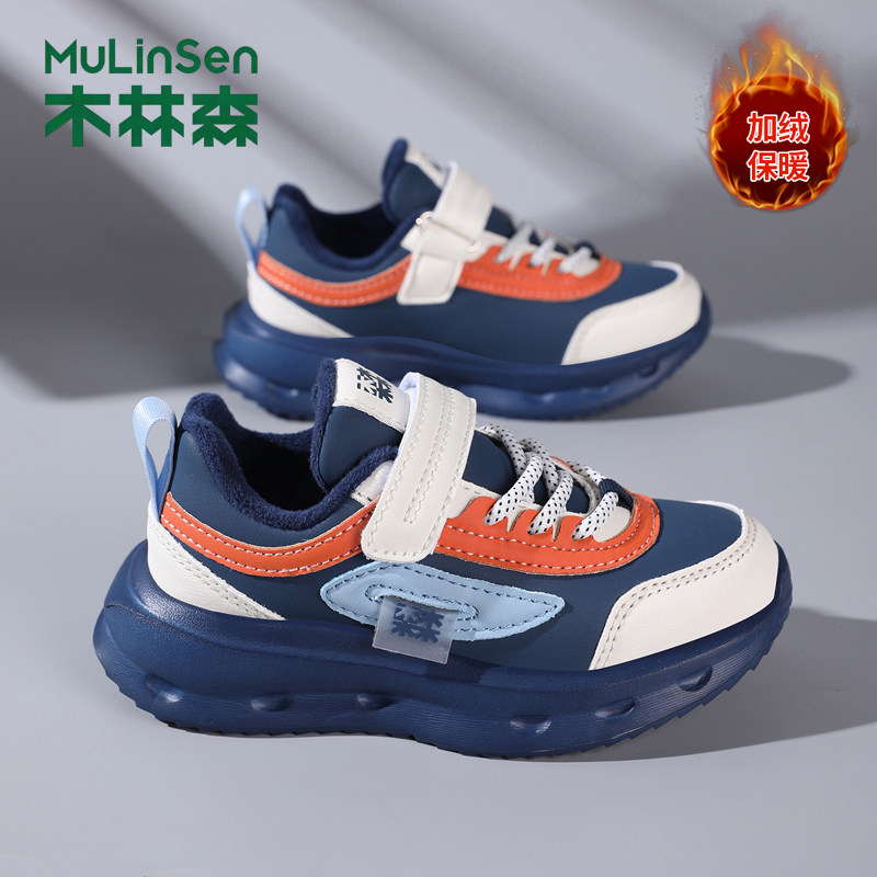 木林森童鞋2025冬季新款皮面加绒保暖儿童运动鞋中大童休闲跑步鞋