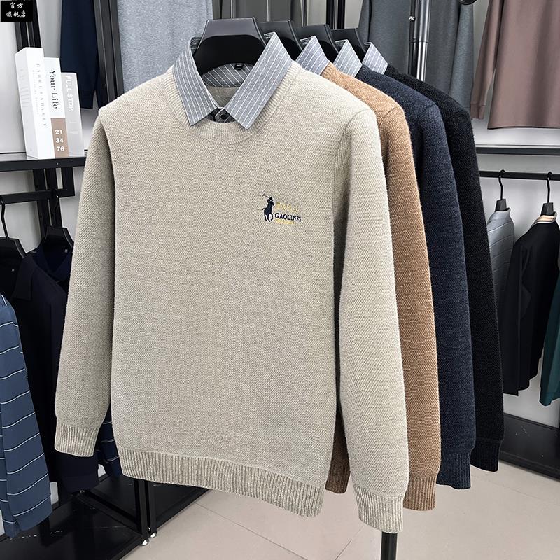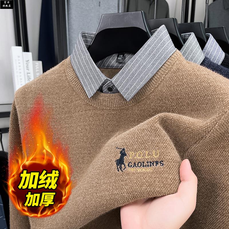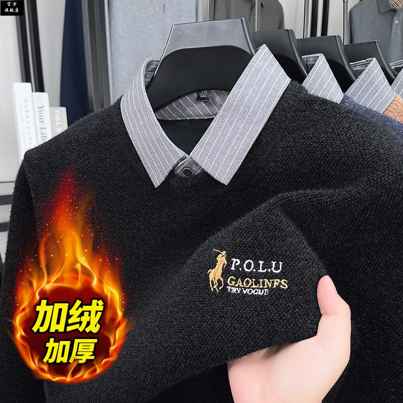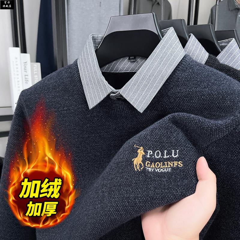 保罗官方假两件衬衫领针织衫男加绒加厚保暖毛衣冬季中年内搭毛衣