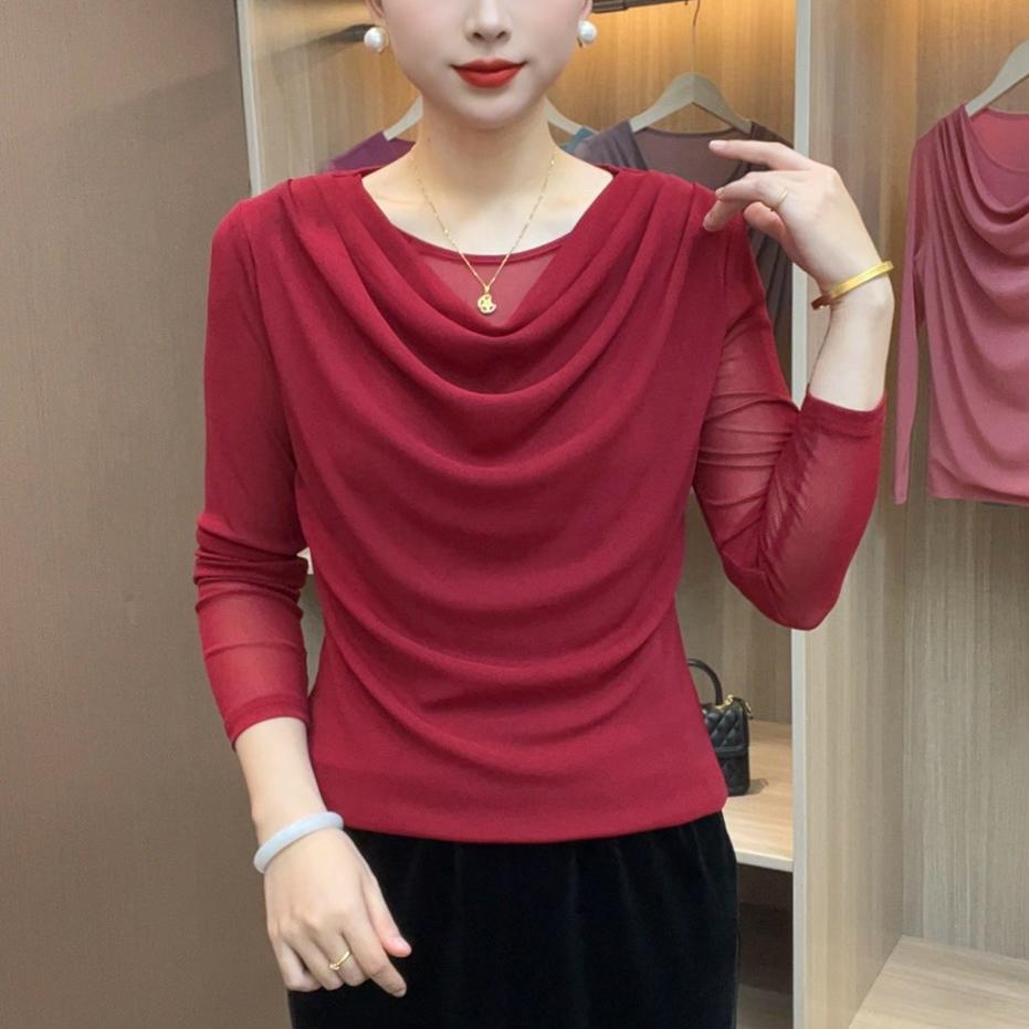 高档网纱打底衫时尚荡领长袖t恤女内搭2025新款洋气显瘦百搭上衣
