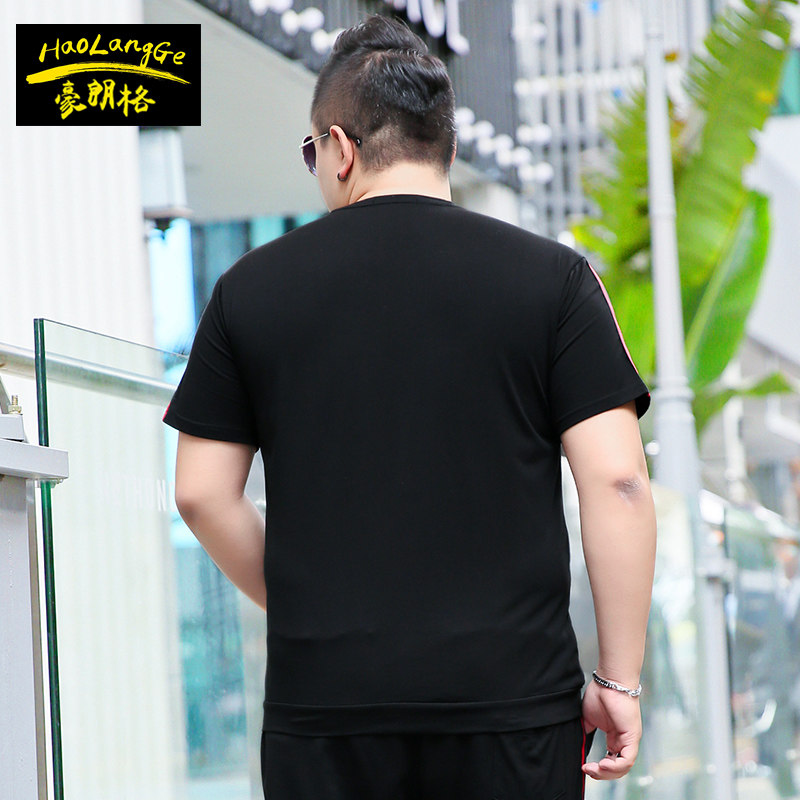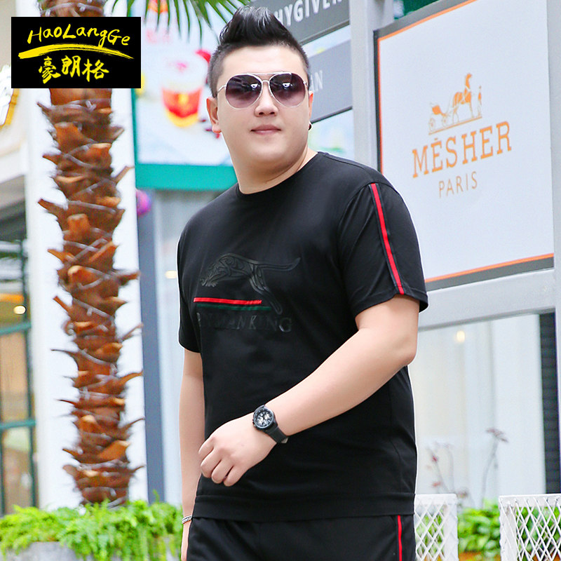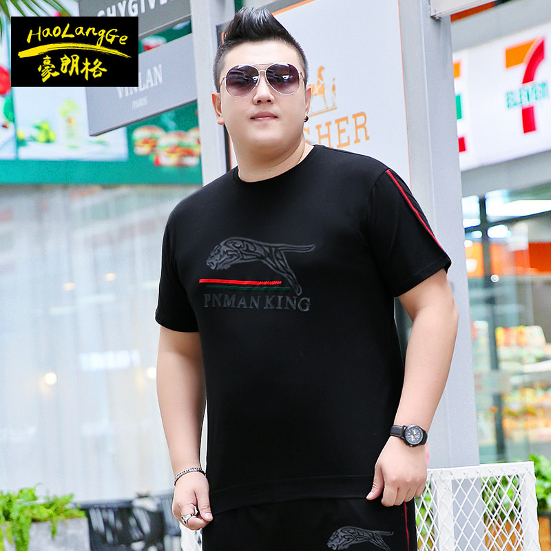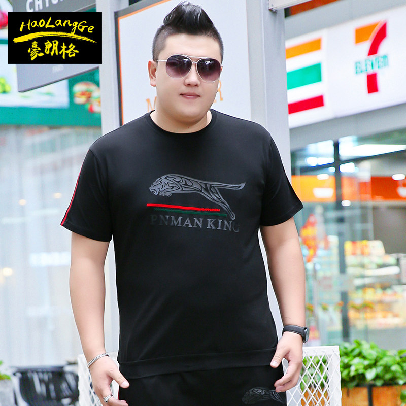 潮胖子男士加肥加大码印花圆领T恤短袖夏装青年体恤肥佬上衣大号
