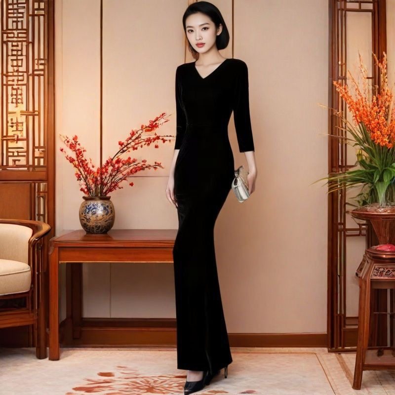 丝绒长袖婚宴妈妈装晚礼服女2025新款高端鱼尾喜婆婆裙主持裙秋冬