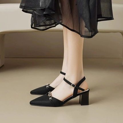 2025年夏季新款凉鞋女时尚百搭粗跟尖头包头单鞋女中跟仙女风高跟