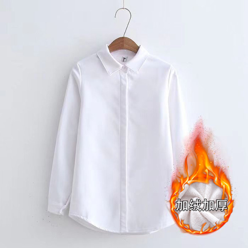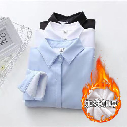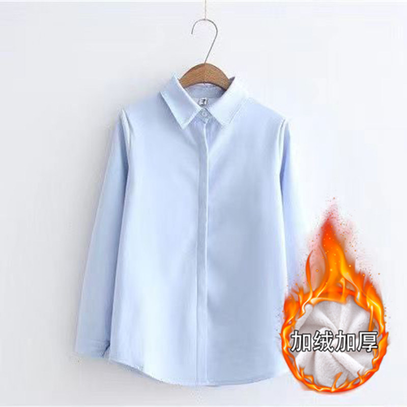 加绒加厚蓝色衬衫女长袖2025秋冬季韩版宽松大码保暖白衬衣打底衫