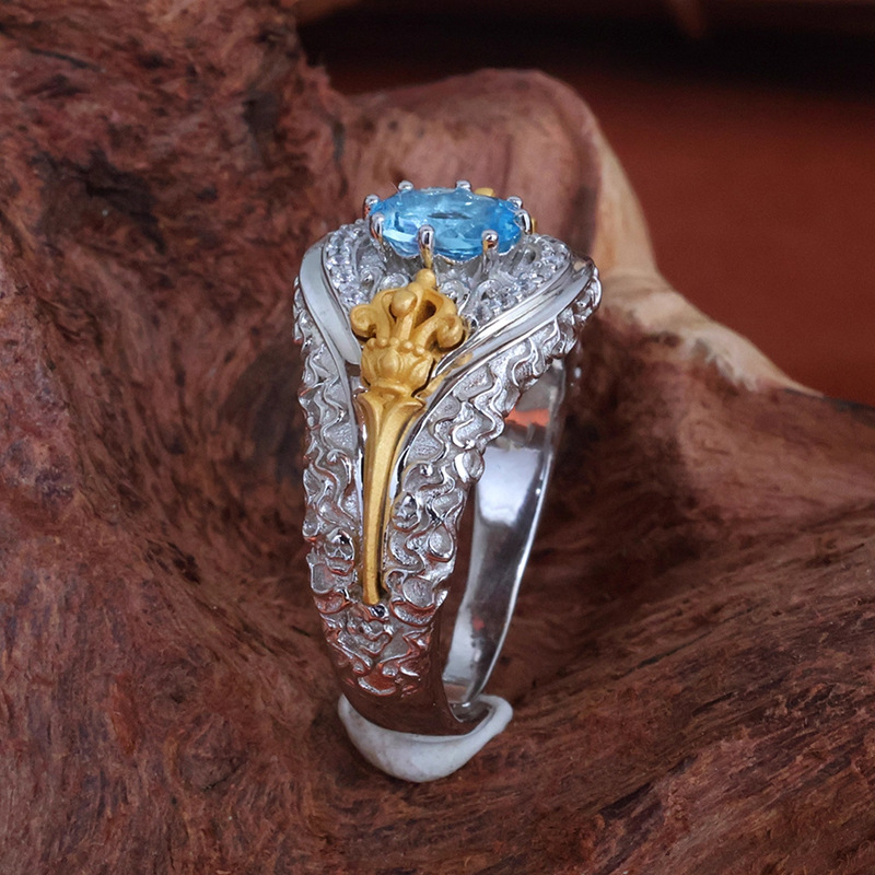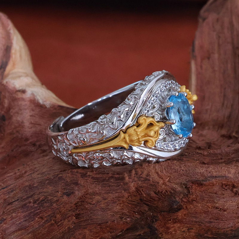 聚缘天珠个性复古雕刻镶嵌托帕石金刚杵活口戒指