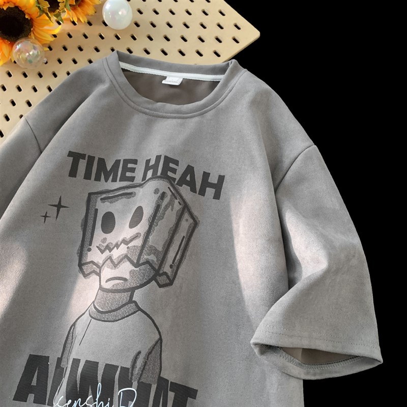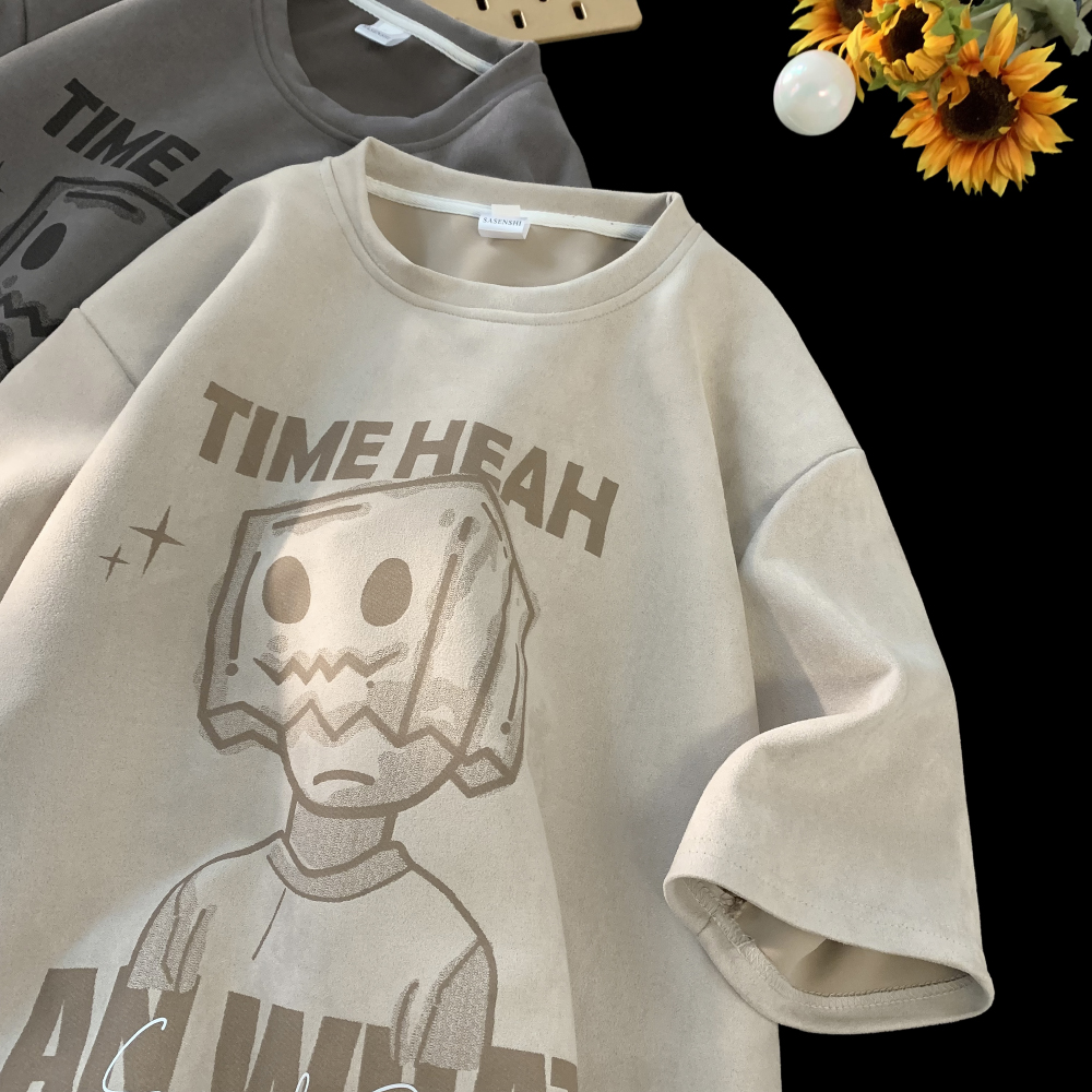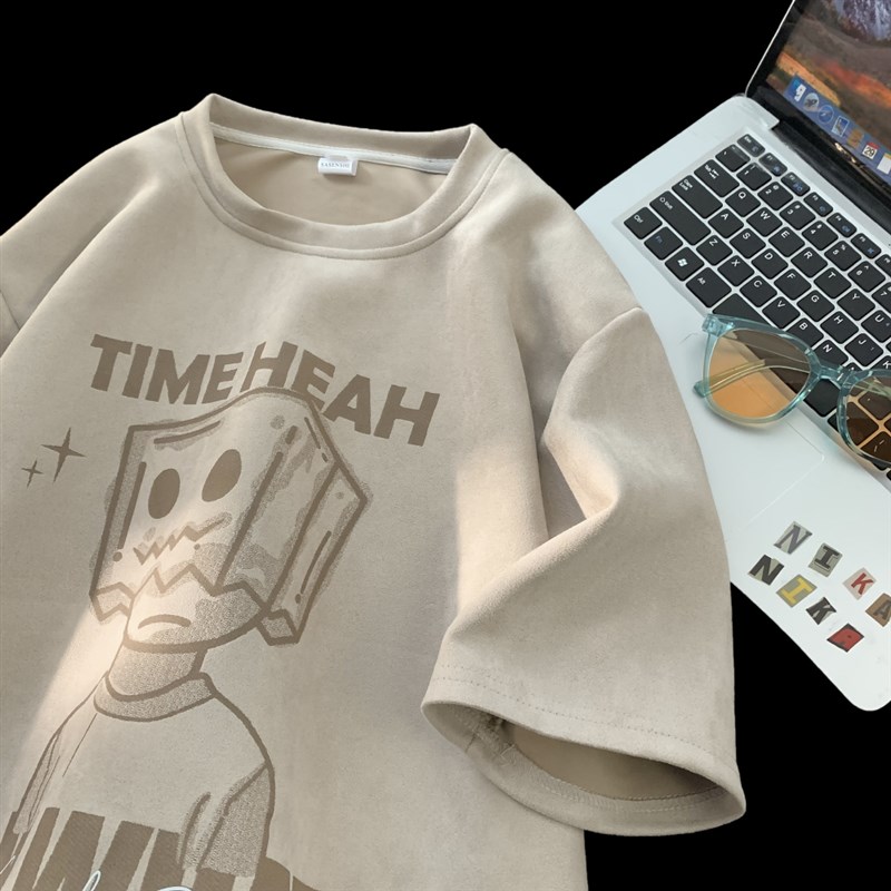 麂皮绒短袖t恤男士夏季重磅小领口痞帅潮牌青少年宽松半袖体恤衫
