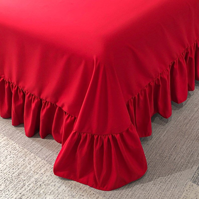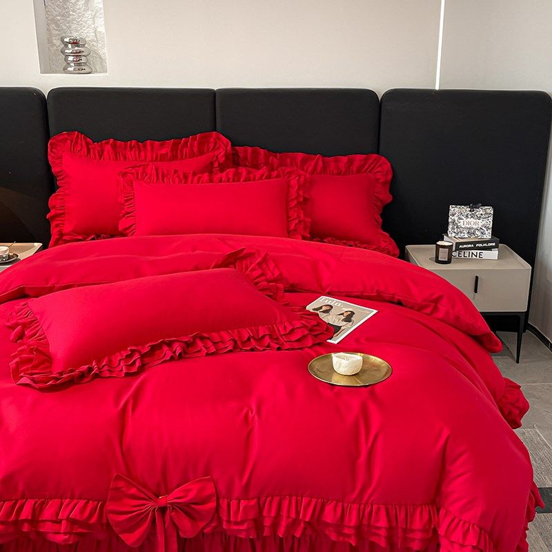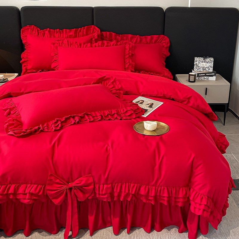 韩式大红色公主风j四件套花边被套婚庆牀上用品牀单被套结婚婚房