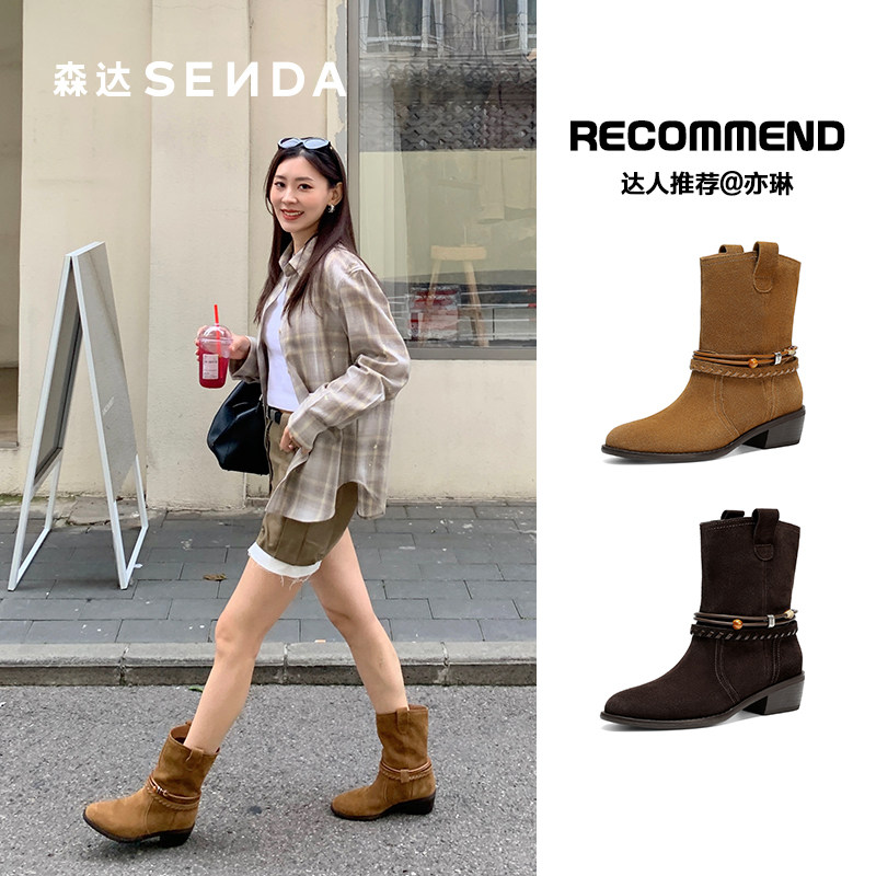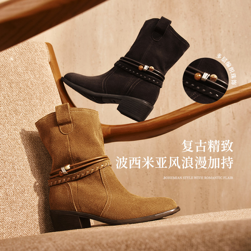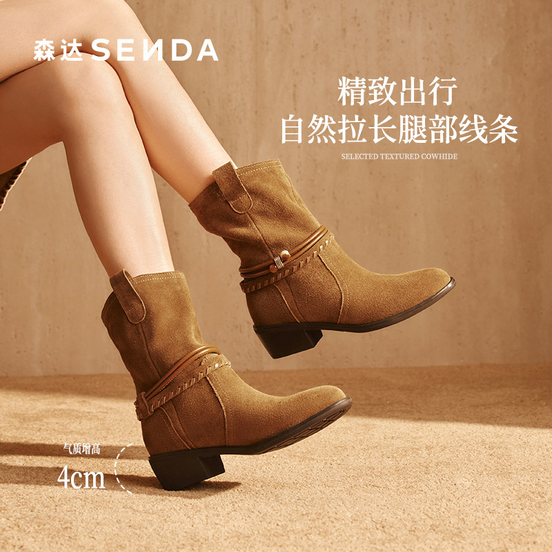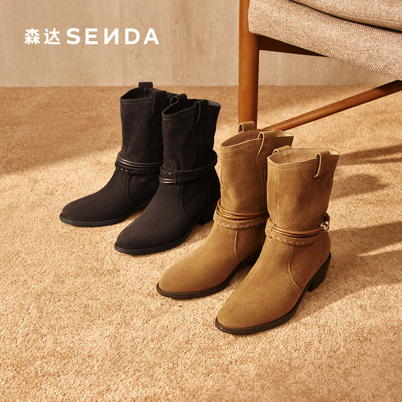 森达牛皮西部靴女25冬新商场同款复古民族风粗跟堆堆靴短靴XVW01