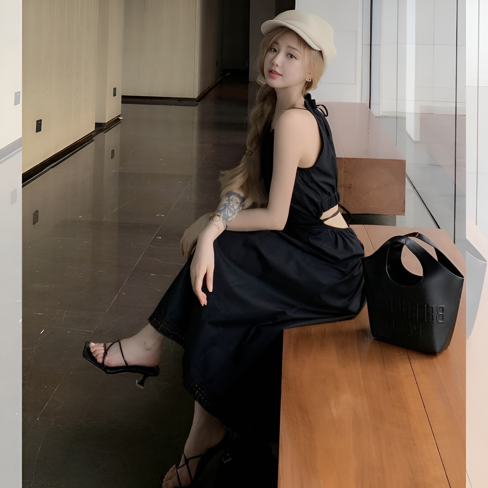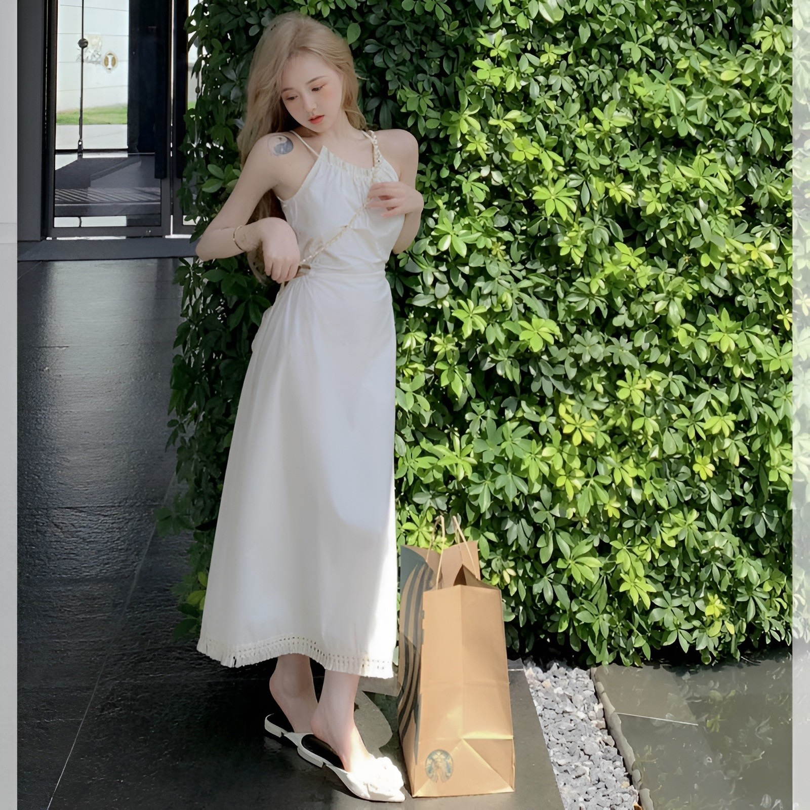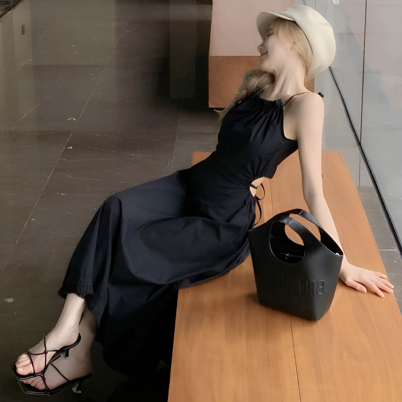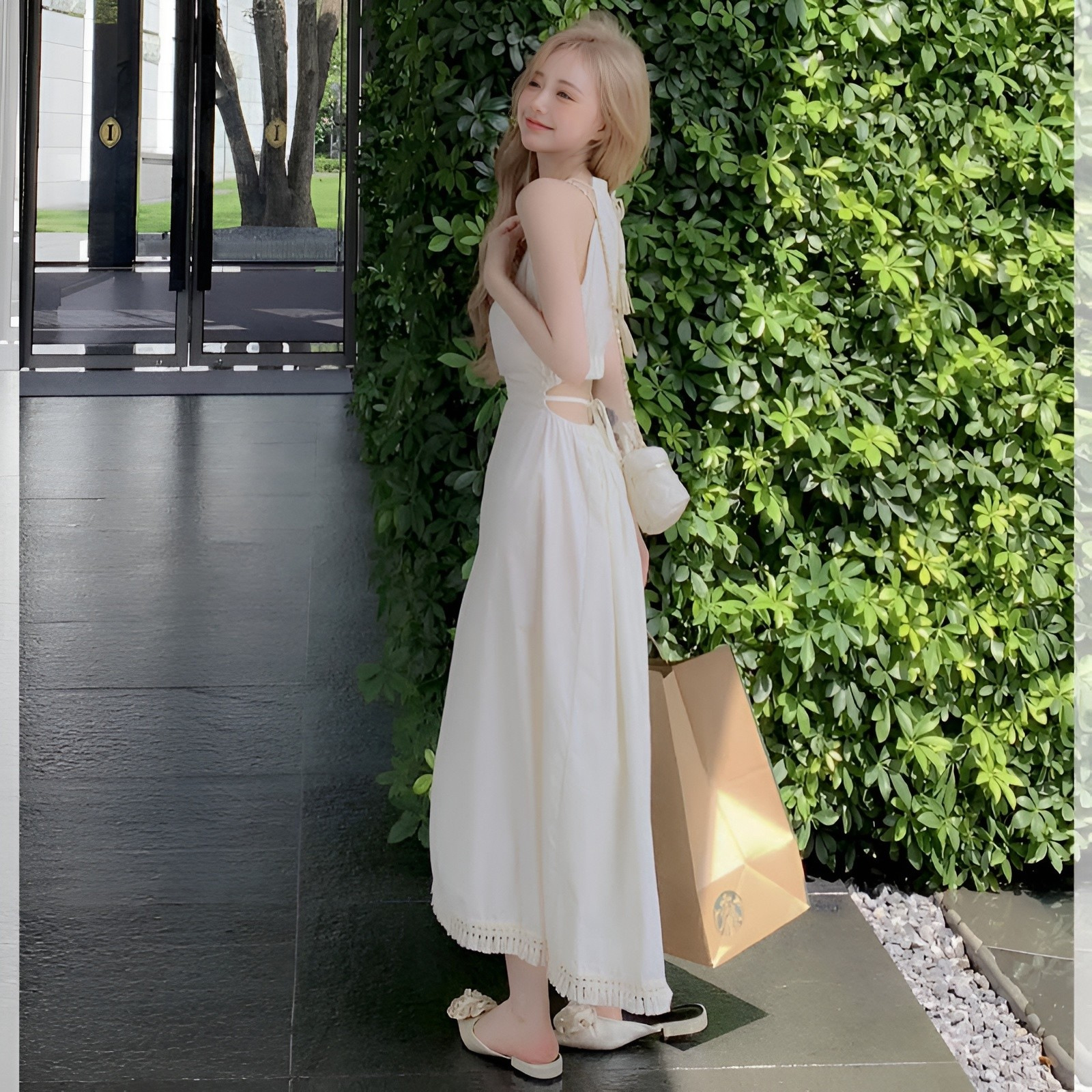 设计感法式露背海边度假沙滩民族风流苏镂空收腰挂脖连衣裙长裙女