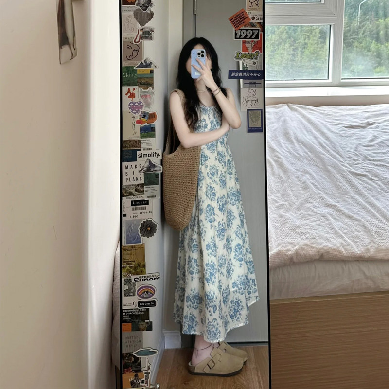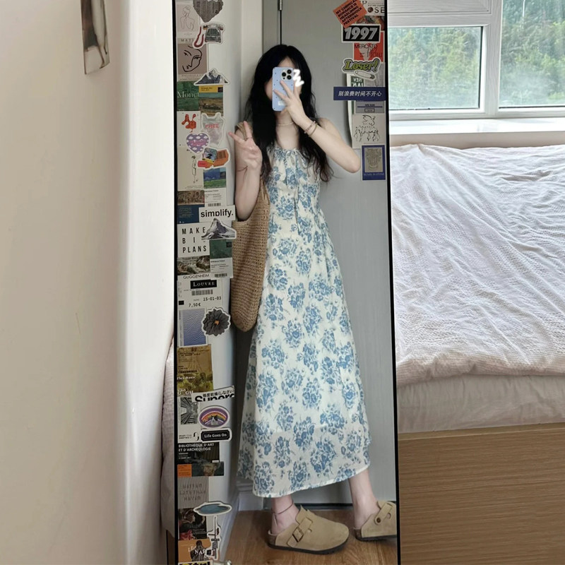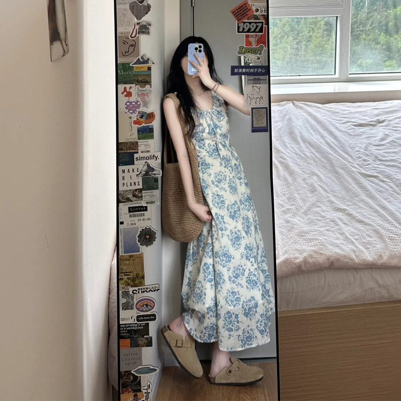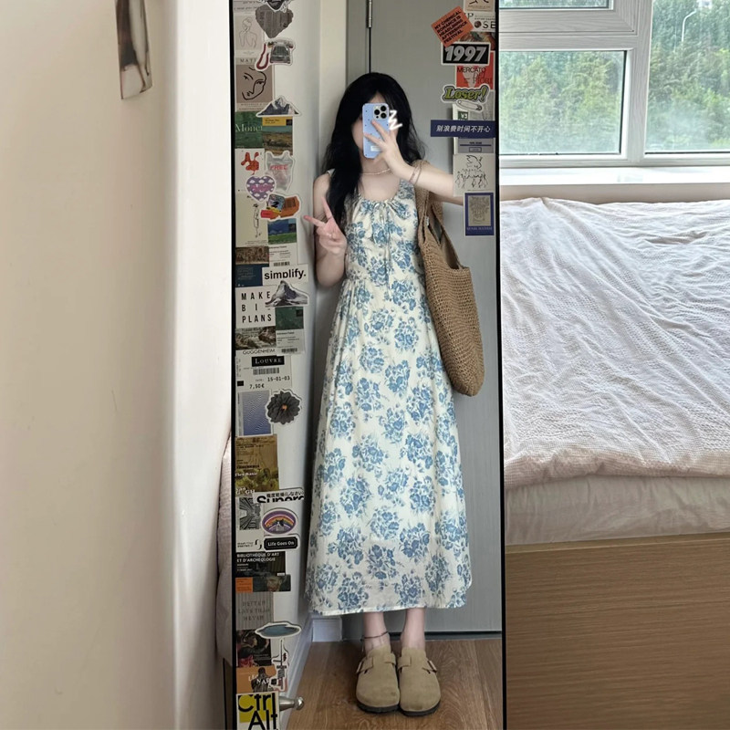 茶歇法式蓝色绑带碎花无袖连衣裙女夏新款度假风收腰显瘦A字长裙