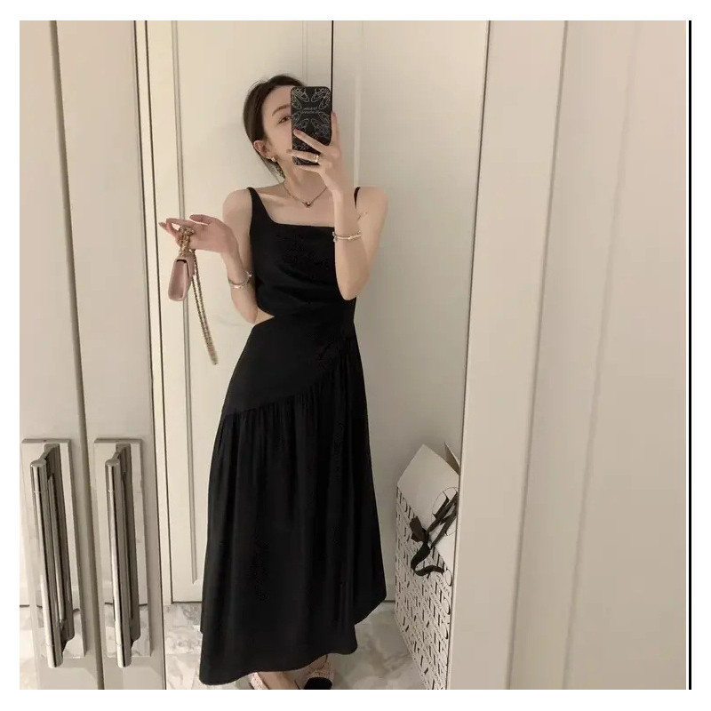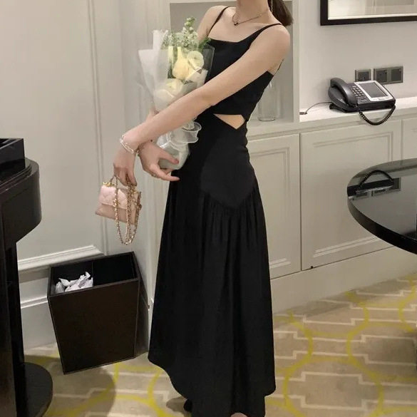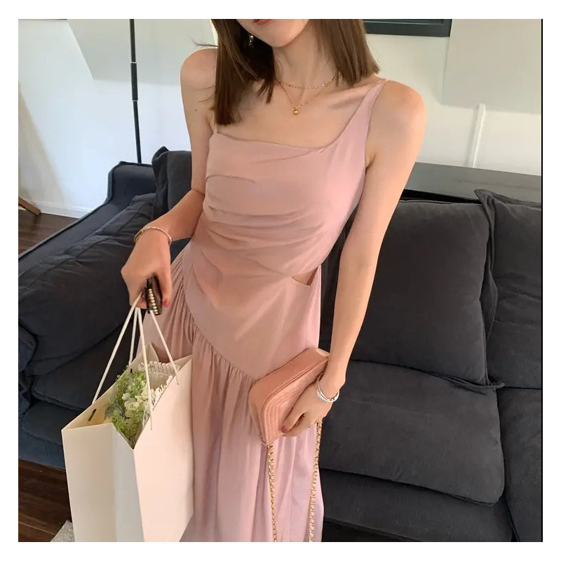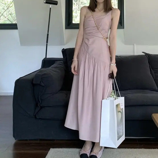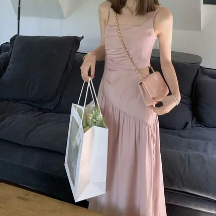 不规则褶皱吊带连衣裙女2024春夏季新款轻奢收腰显瘦中长款裙子