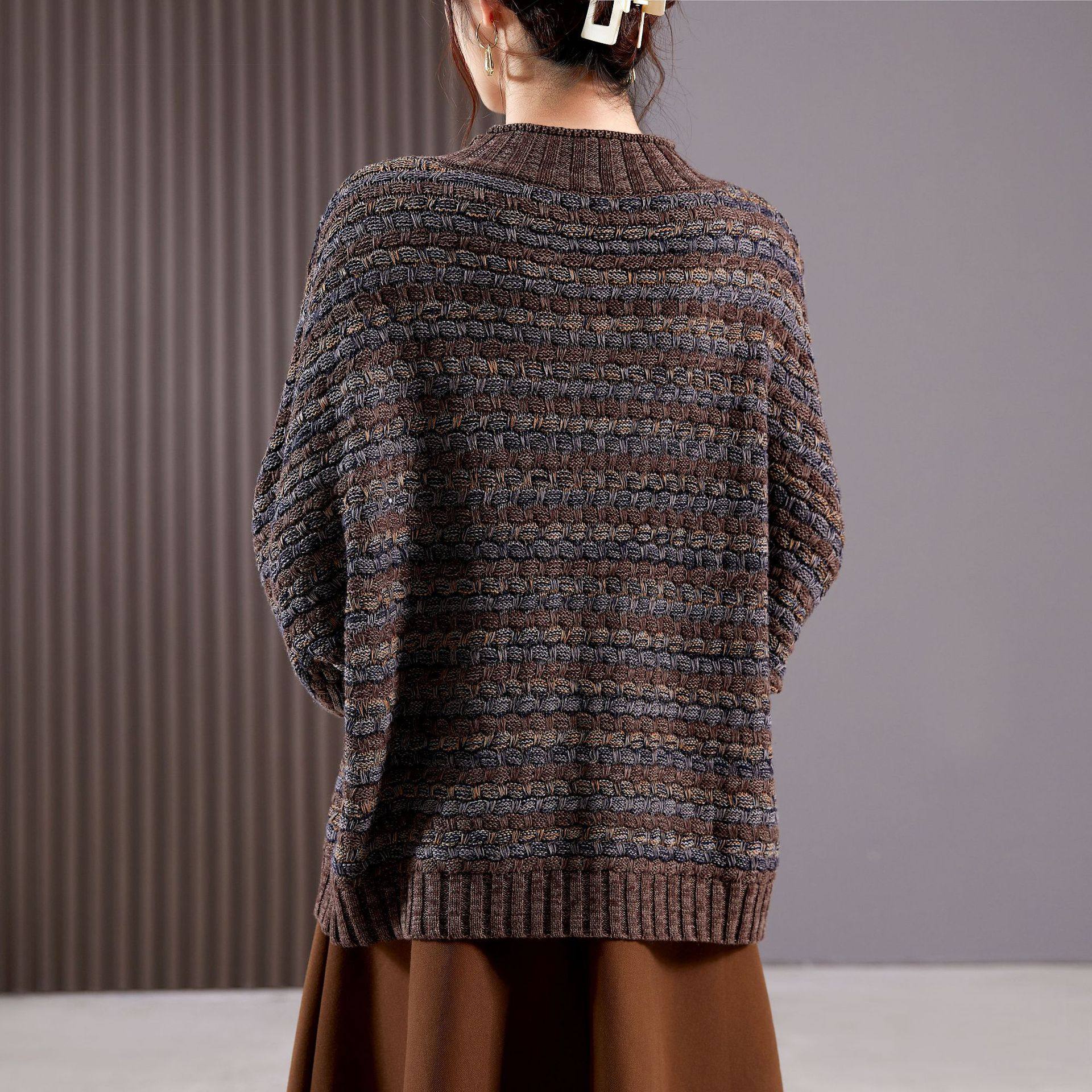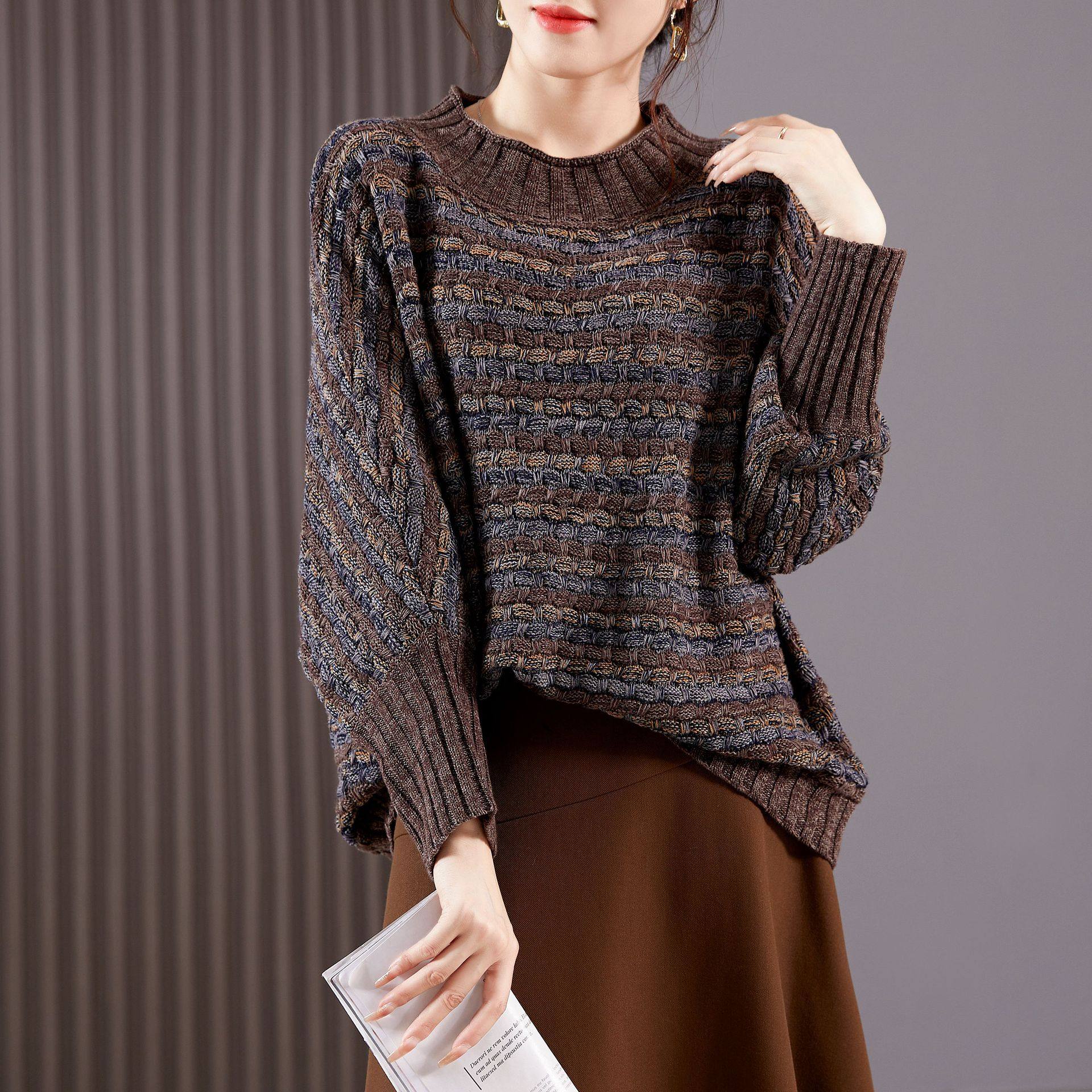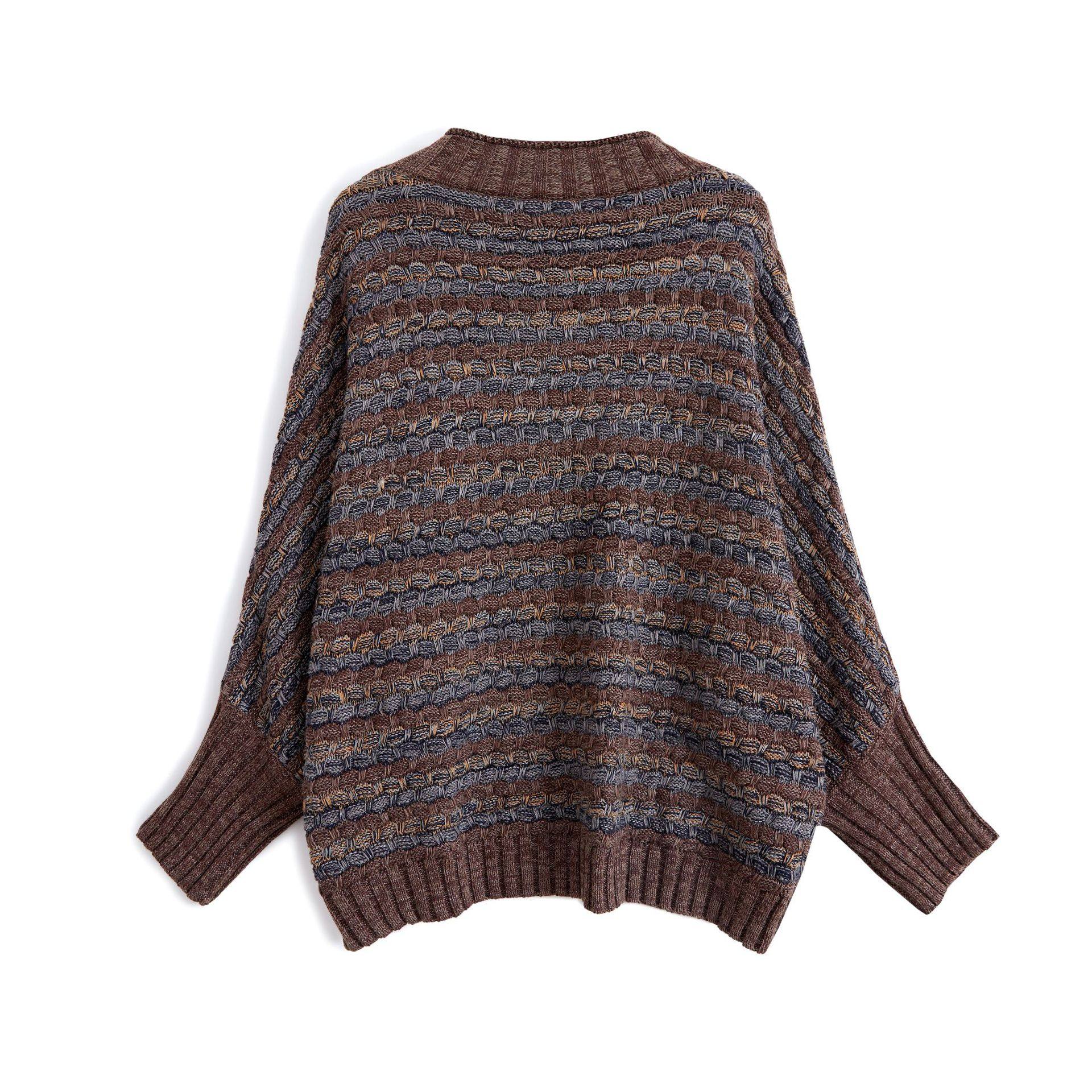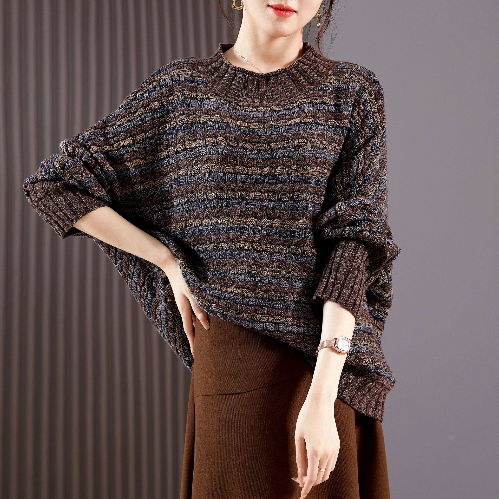 秋冬季新款咖啡色纯棉针织套头毛衣宽松长袖蝙蝠衫上衣 女装