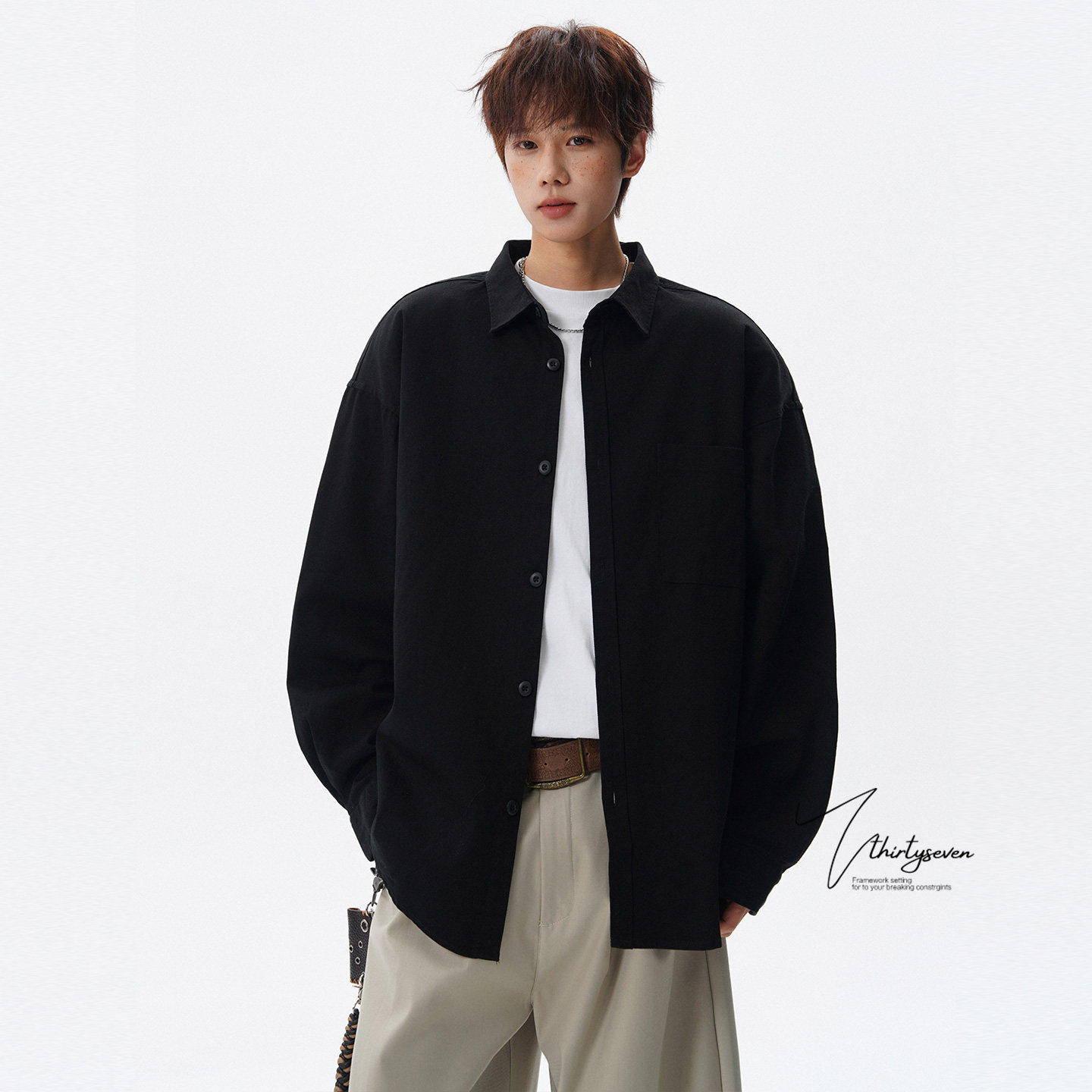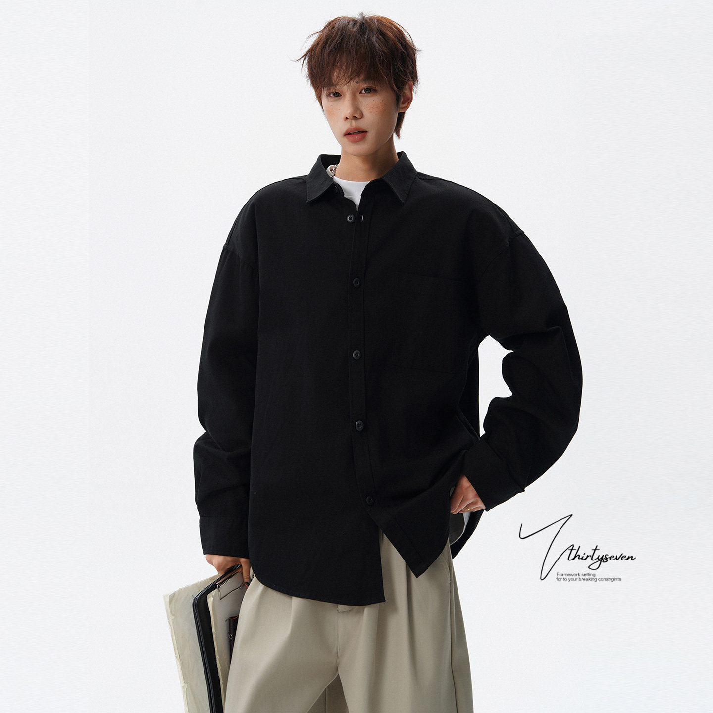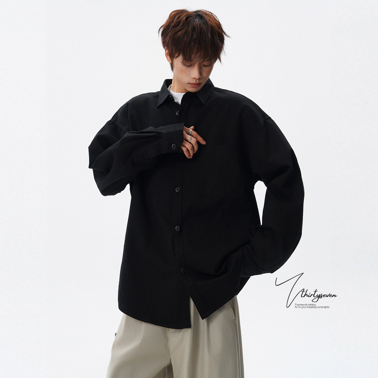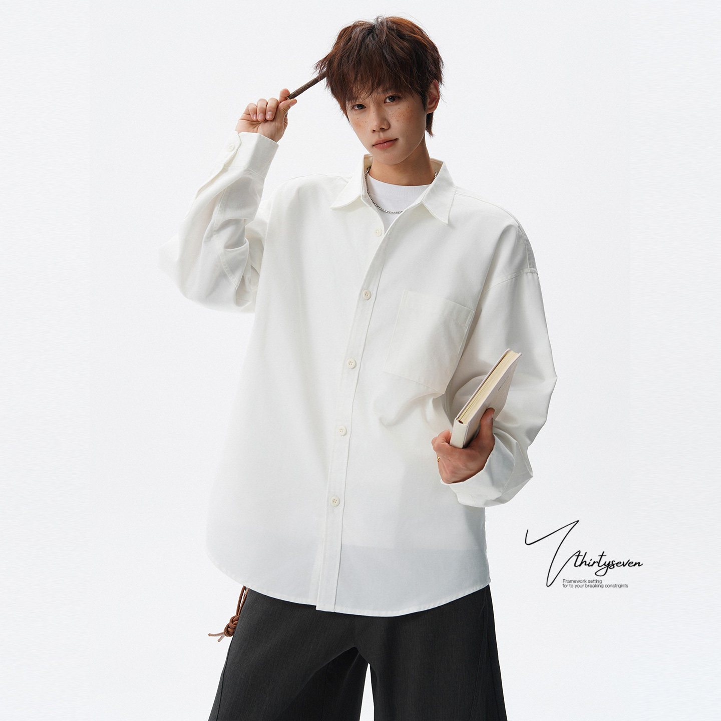 V37美式潮流简约风白色纯棉长袖衬衫男秋冬宽松百搭通勤显瘦衬衣