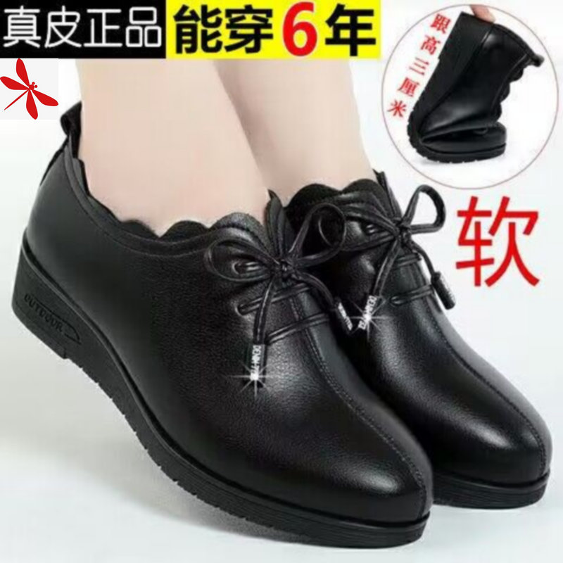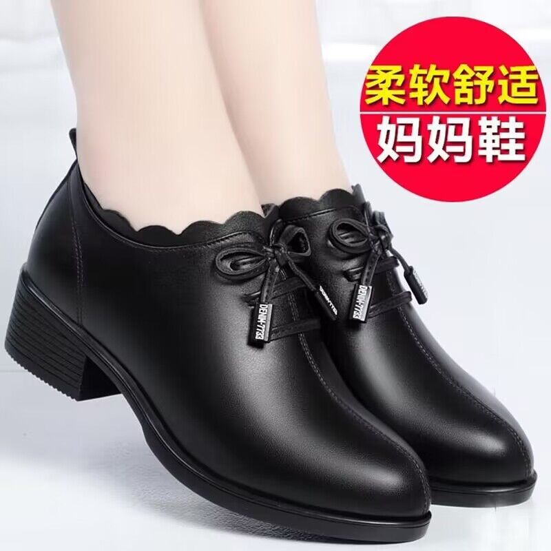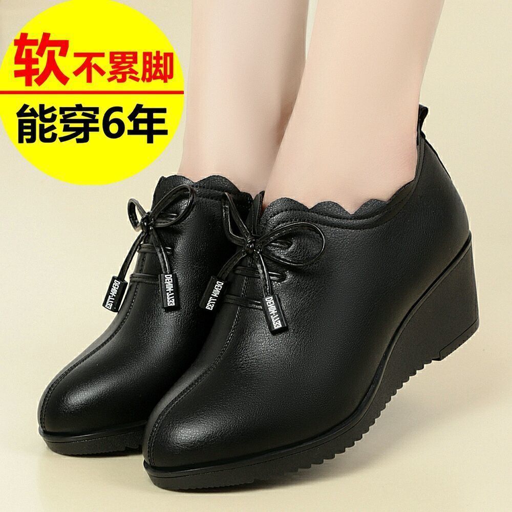 妈妈鞋春秋新款真皮深口舒适侧拉链坡跟防滑女单鞋中老年中跟皮鞋