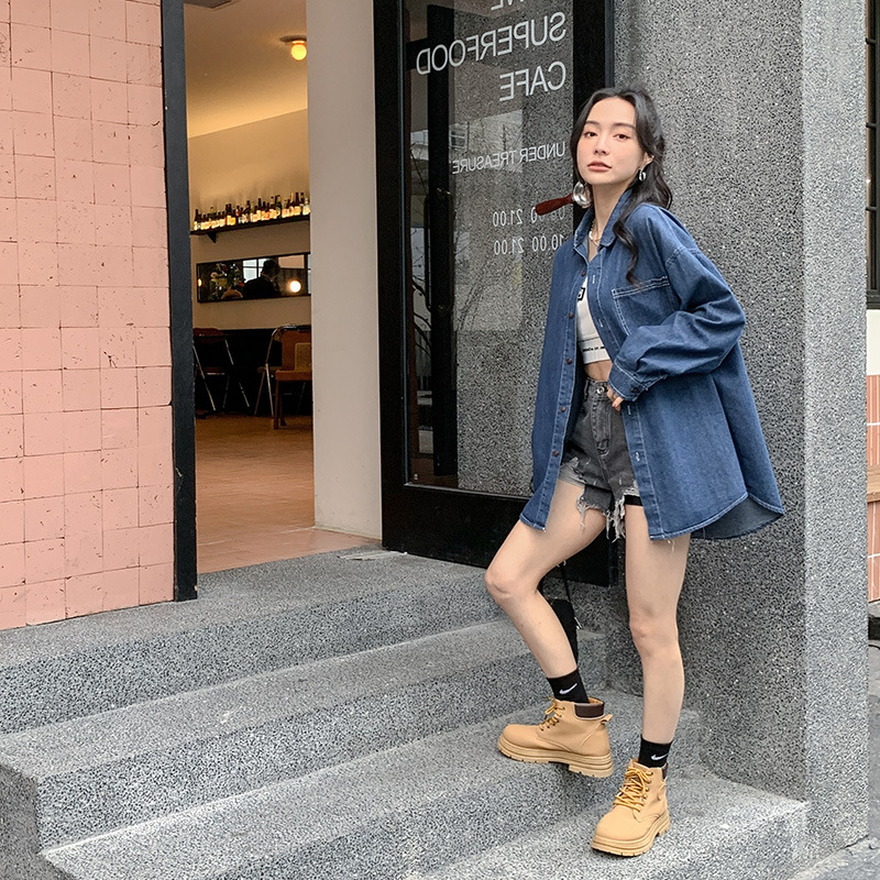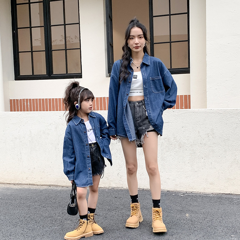 春秋亲子装蓝色牛仔衬衫一家三口炸街母女装母子装家庭装复古外套