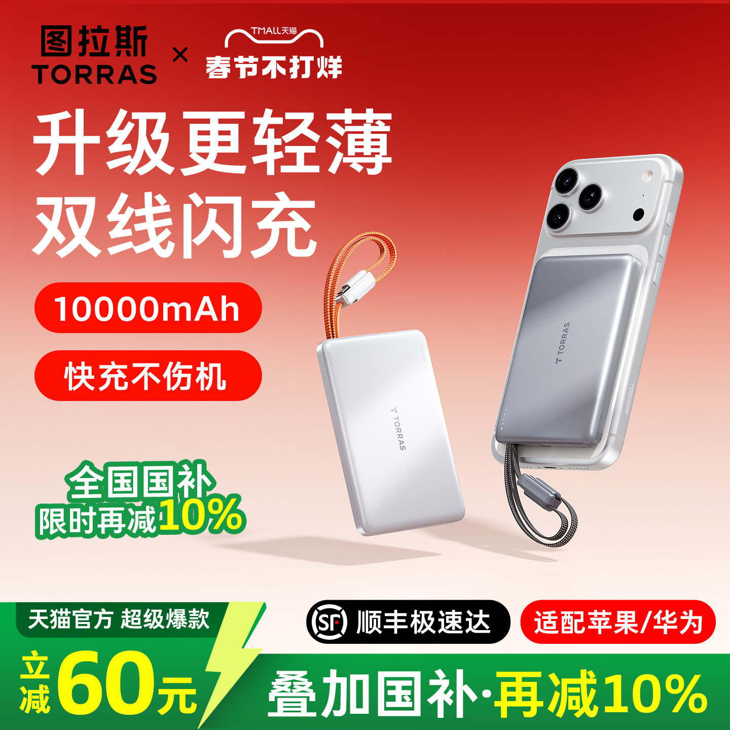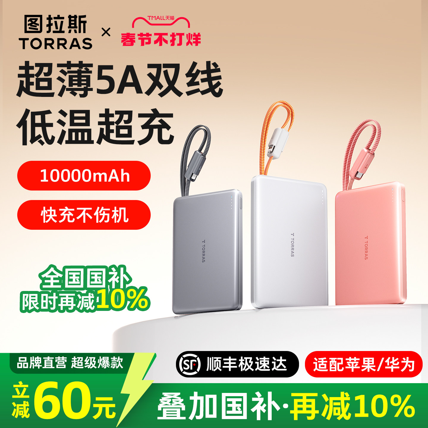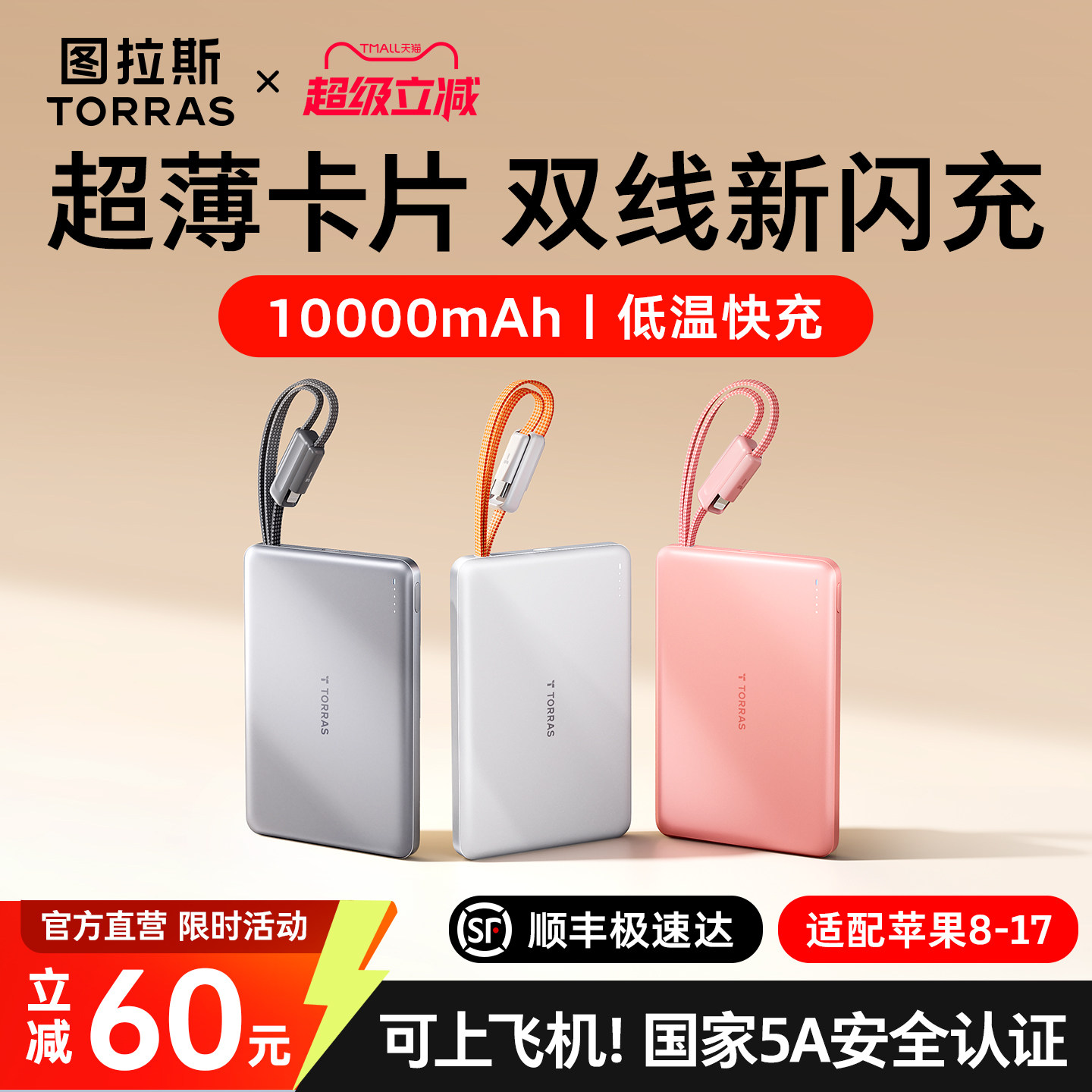 图拉斯自带双线小冰片2026新款充电宝3c认证可上飞机超薄小巧便携快充大容量20000毫安适用苹果17移动电源米