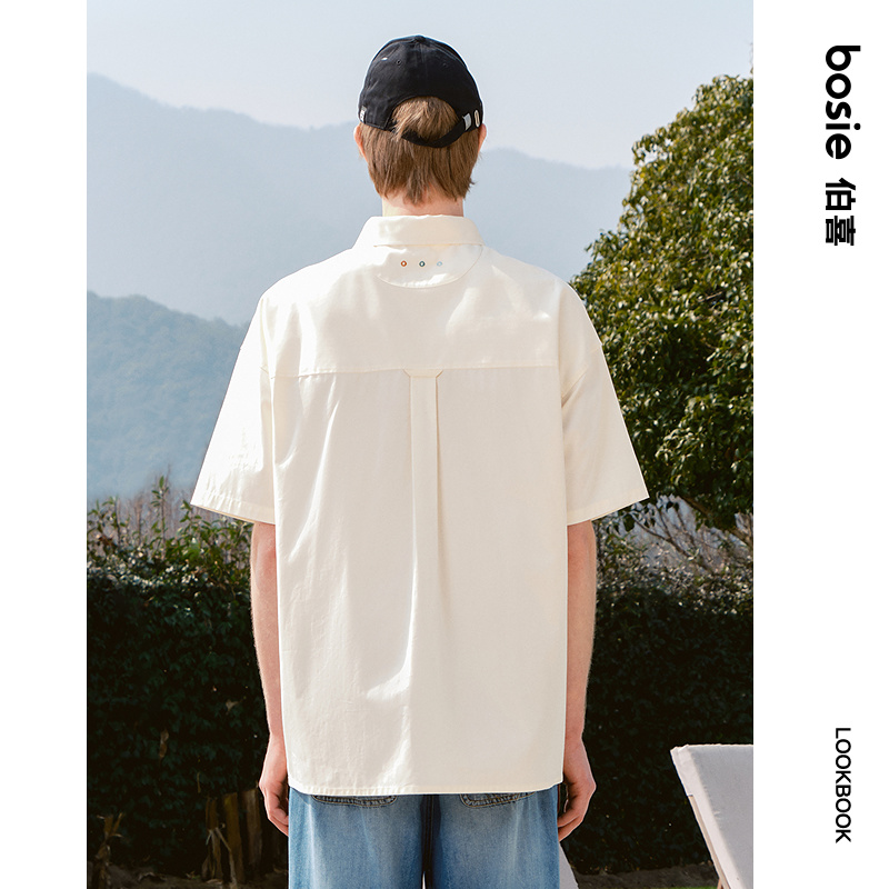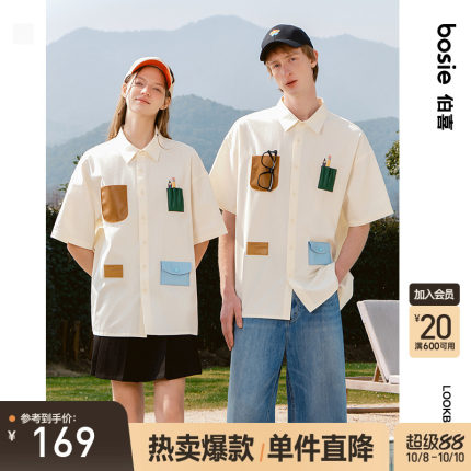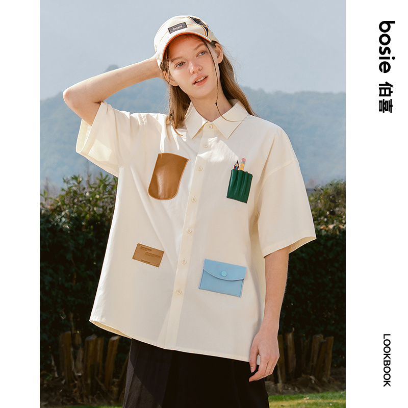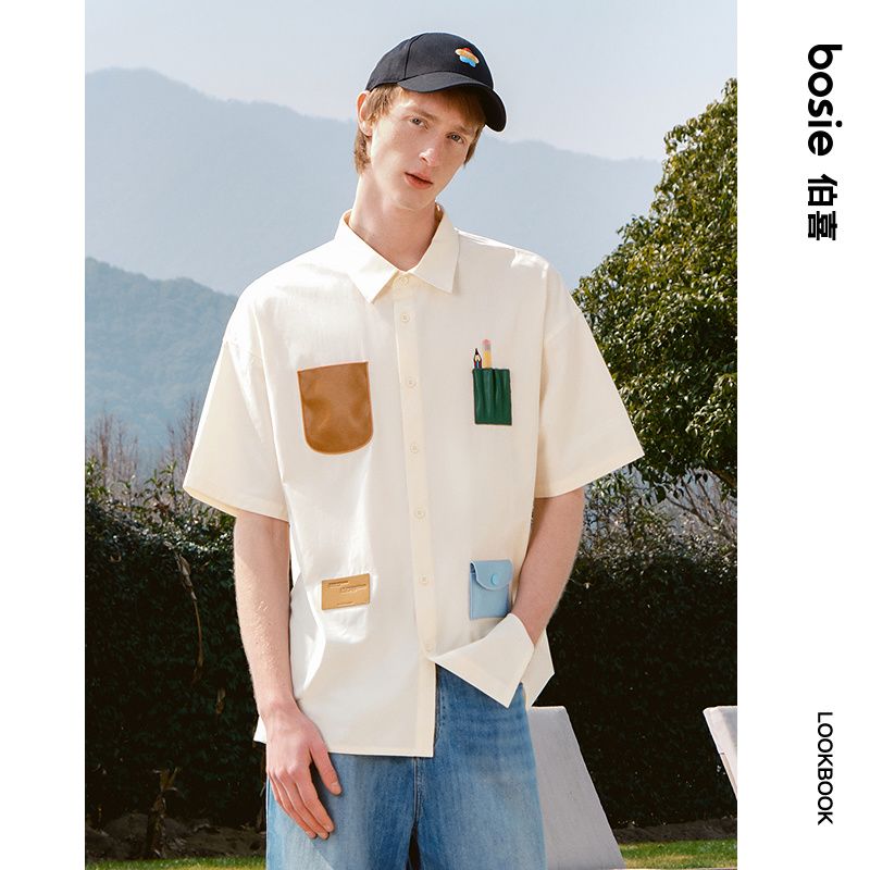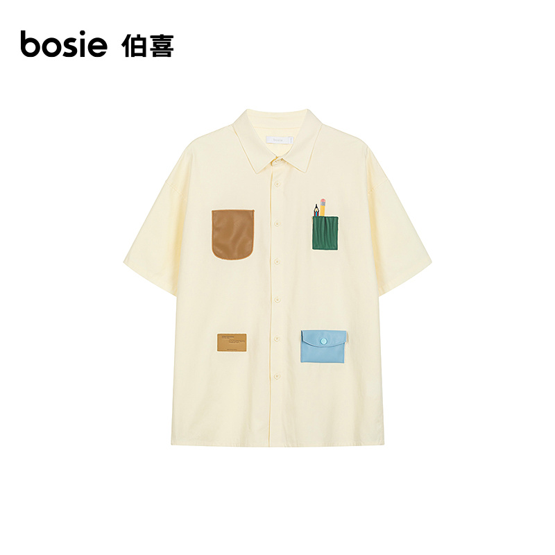 bosie2025年夏季新款撞色趣味口袋设计短袖衬衫男情侣宽松衬衣潮