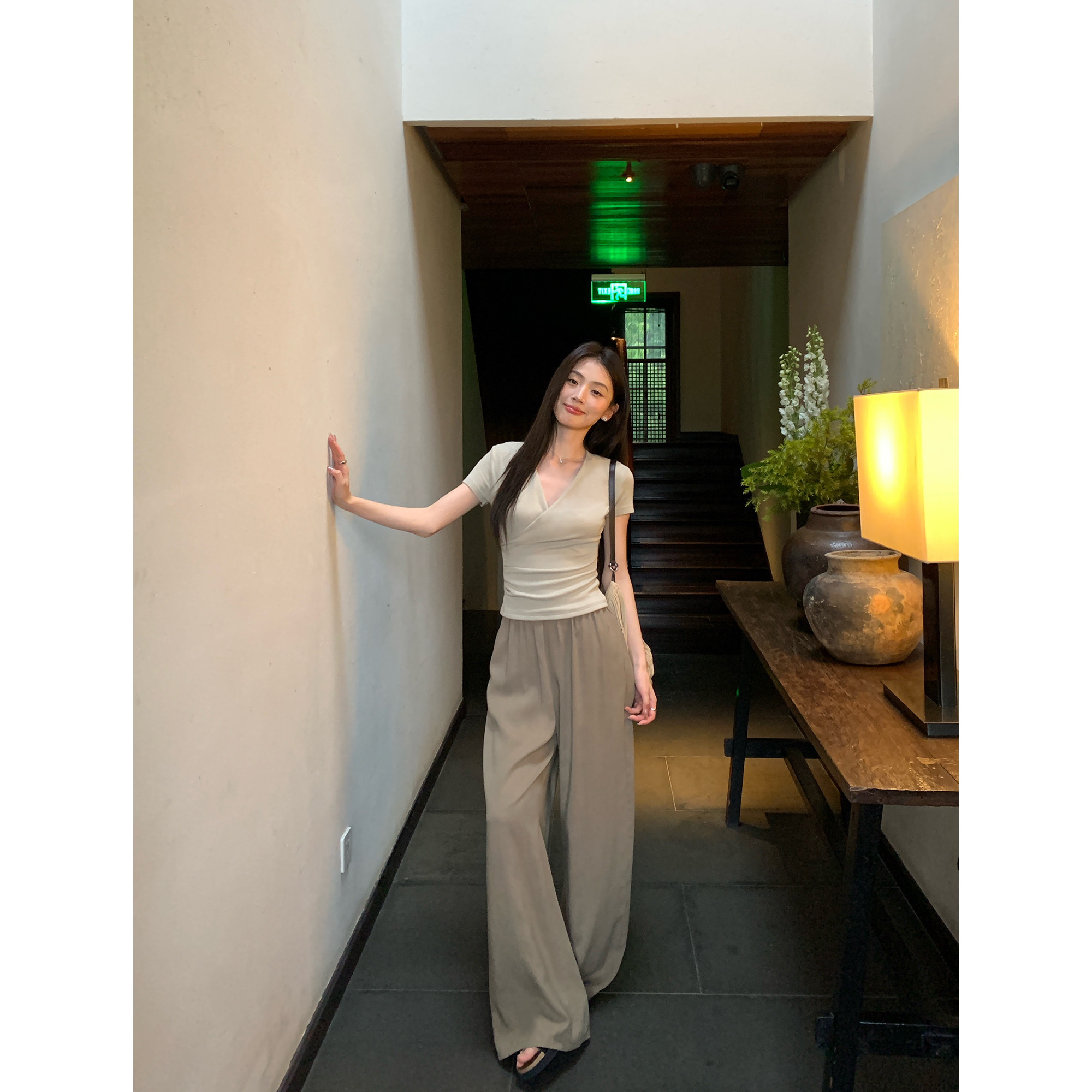 pusumede极简v领交叉短袖T恤女修身夏季短款设计感气质针织上衣