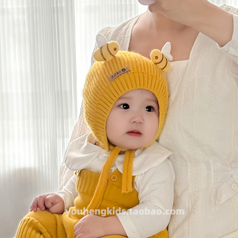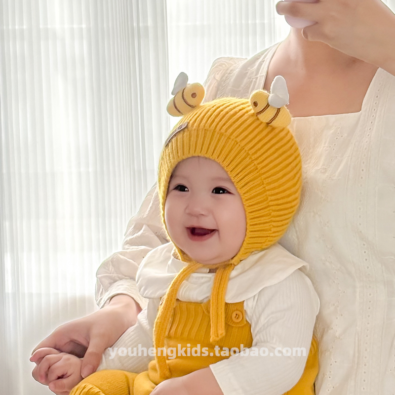 婴儿帽子秋冬季宝宝婴幼儿可爱小蜜蜂毛线帽加厚护耳帽冬天针织帽