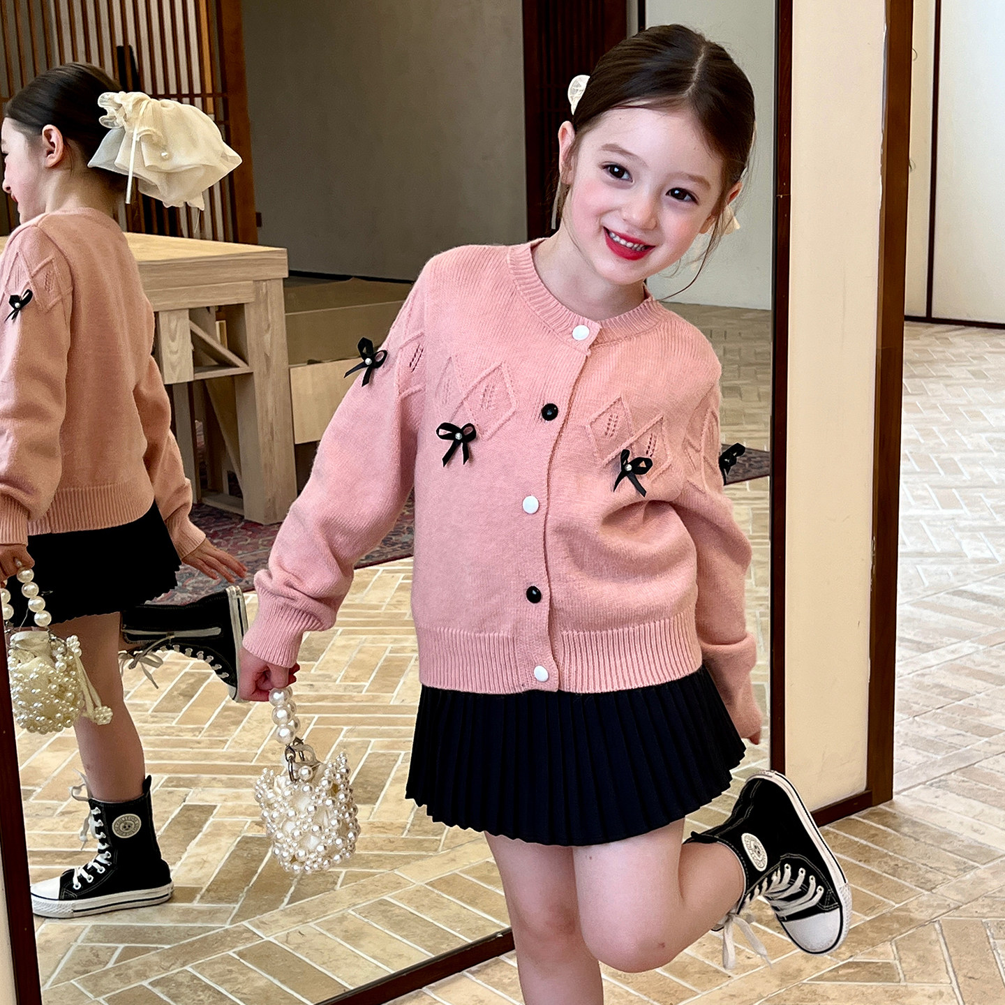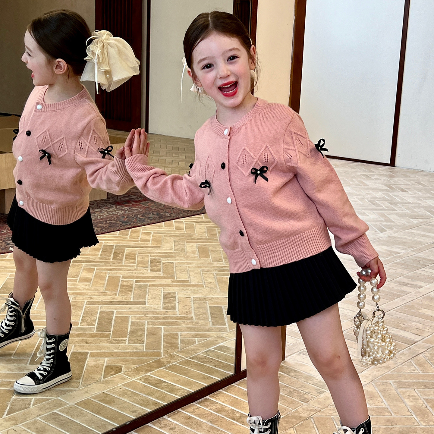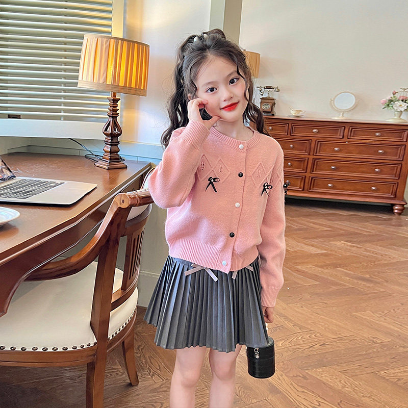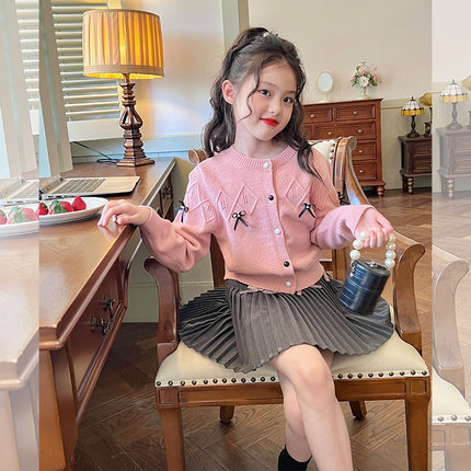 栀了成长记童装女童粉色蝴蝶结毛衣春秋新款儿童女孩针织开衫外套