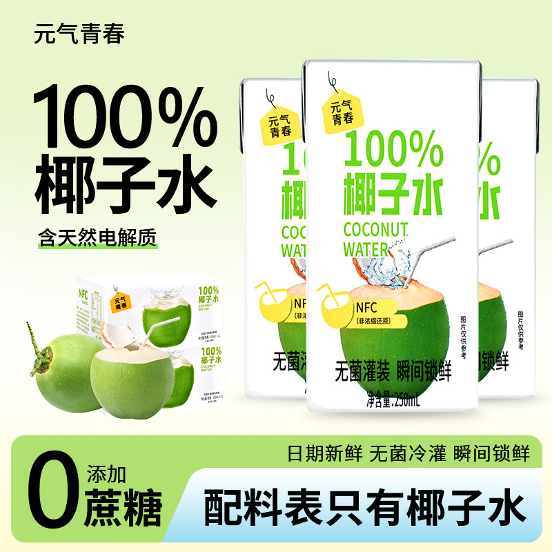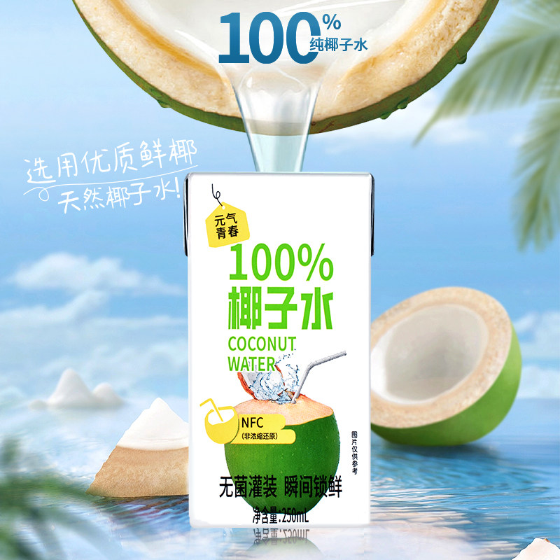100%椰子水250ml*10盒0蔗糖纯椰子水NFC果汁饮料烧烤火锅聚餐畅饮