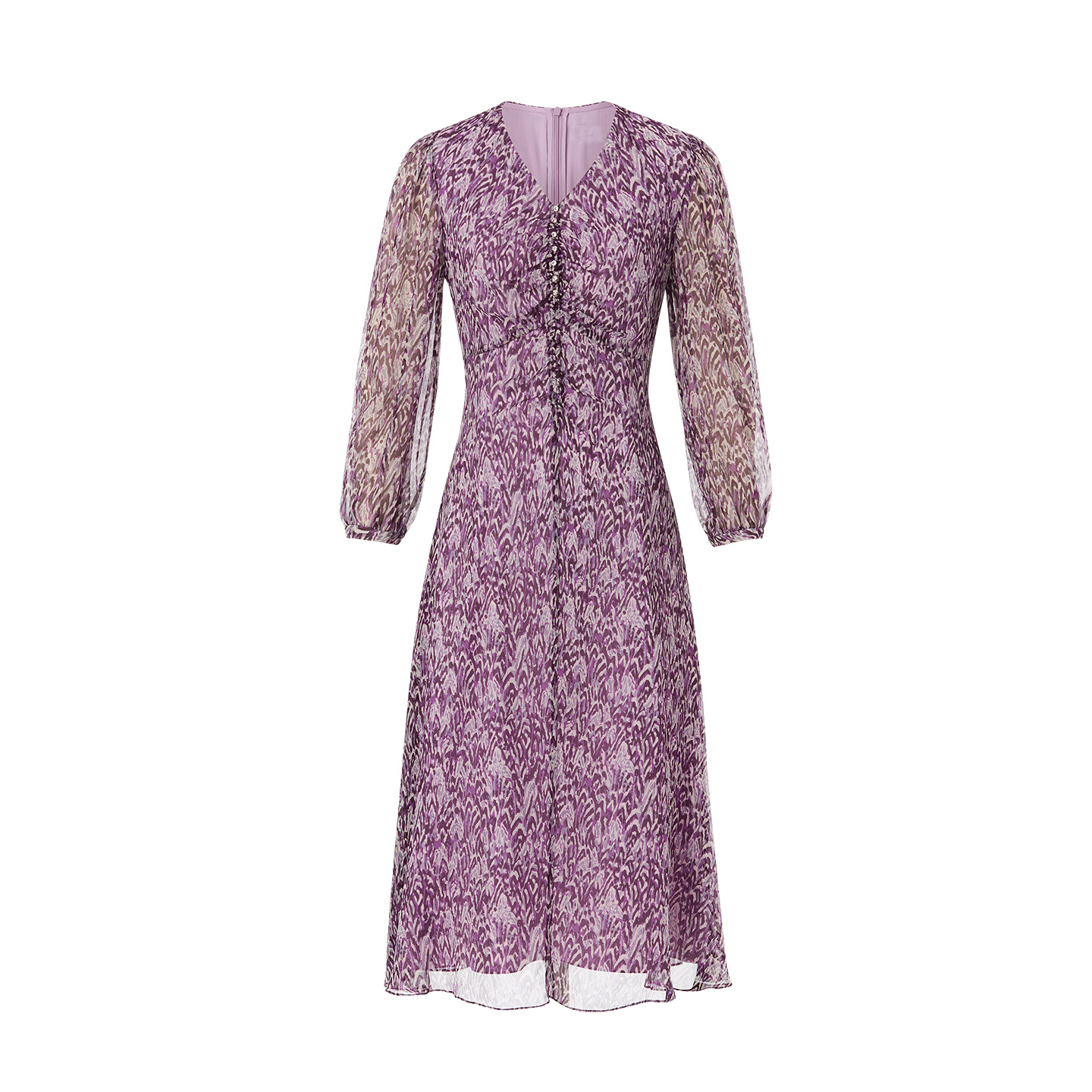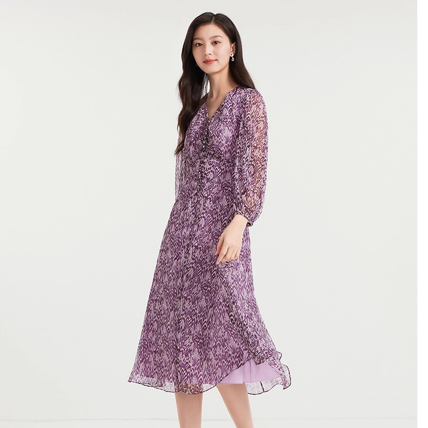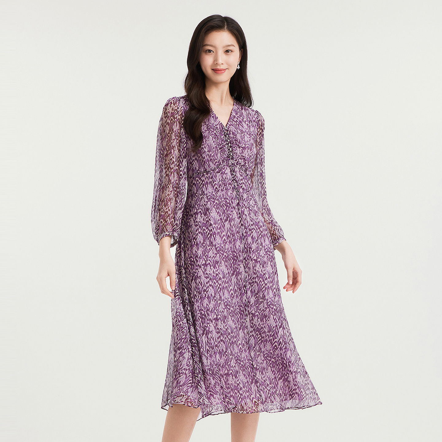 珂家同款秋季V领长袖印花连衣裙