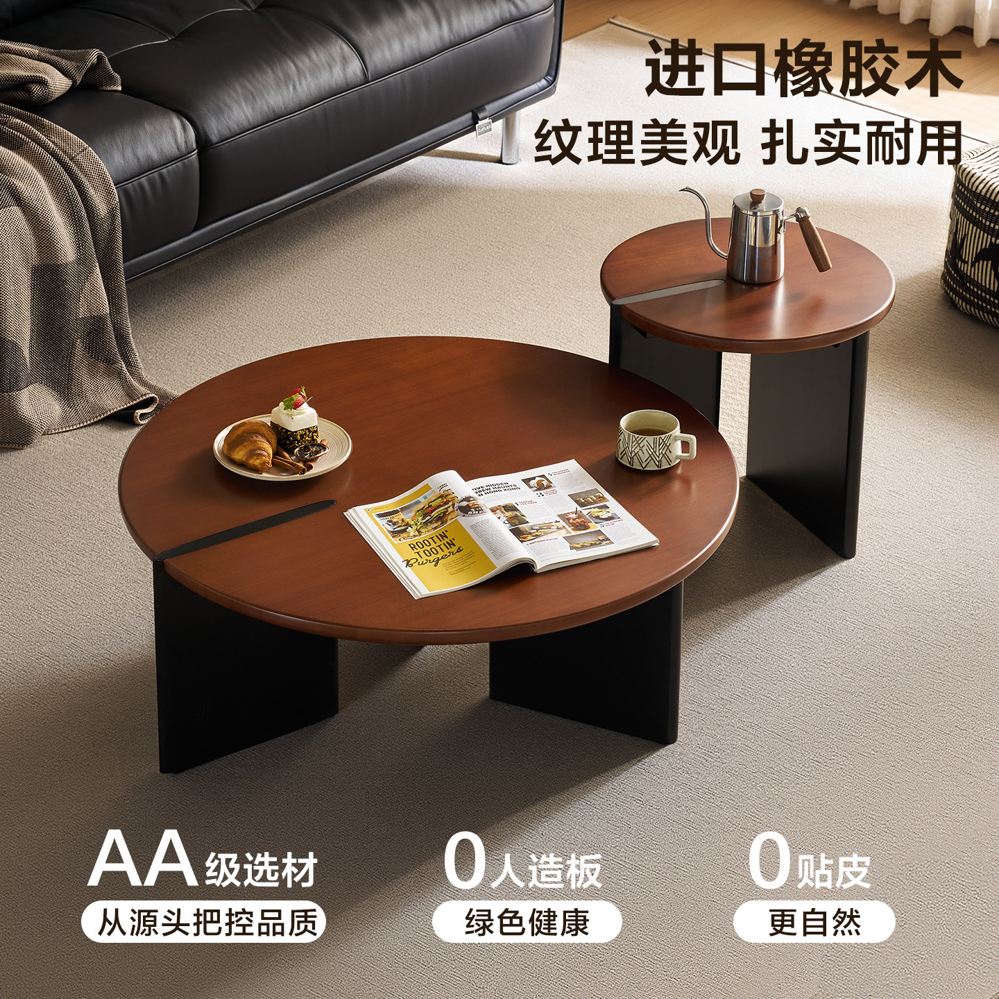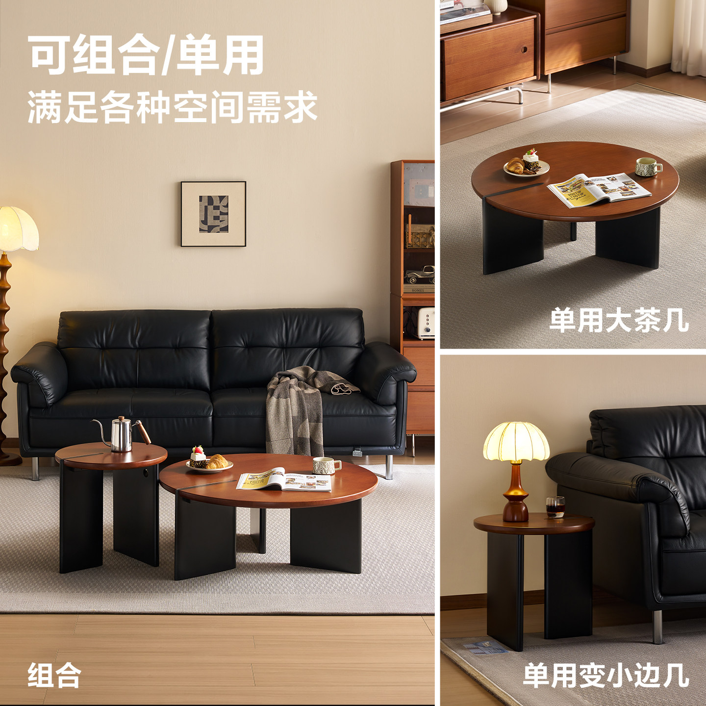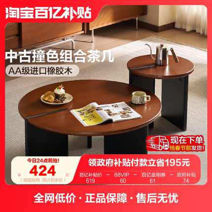 全友家居客厅家用中古风圆形实木茶几2025新款沙发边几茶桌组合